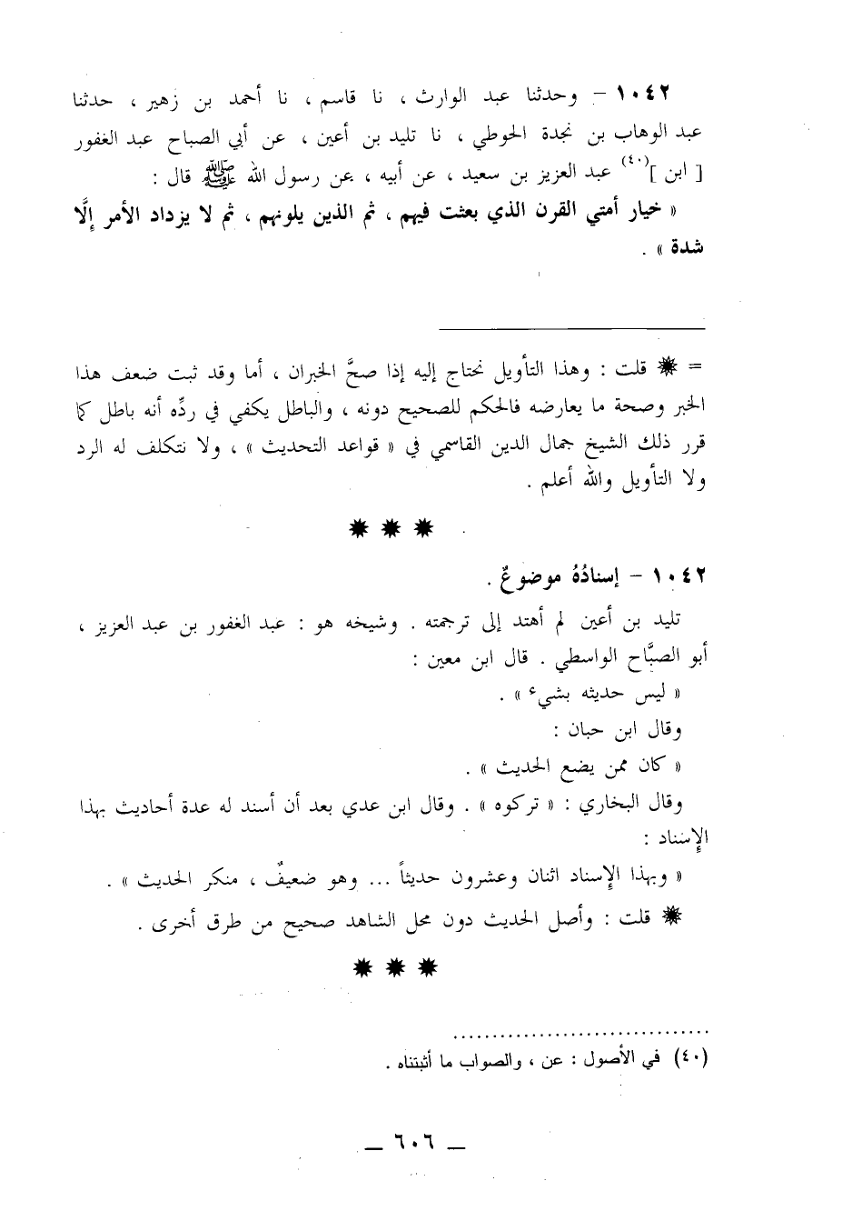 1042 - وَحَدَّثَنَا عَبْدُ الْوَارِثِ، نا قَاسِمُ، نا أَحْمَدُ بْنُ زُهَيْرٍ، حَدَّثَنَا عَبْدُ الْوَهَّابِ بْنُ نَجْدَةَ الْحَوْطِيُّ، نا تَلِيدُ بْنُ أَعْيَنَ، عَنْ أَبِي الصَّبَّاحِ عَبْدِ الْغَفُورِ بْنِ عَبْدِ الْعَزِيزِ بْنِ سَعِيدٍ، عَنْ أَبِيهِ، عَنْ رَسُولِ اللَّهِ صَلَّى اللَّهُ عَلَيْهِ وَسَلَّمَ قَالَ: §«خِيَارُ أُمَّتِي الْقَرْنُ الَّذِي بُعِثْتُ فِيهِمْ ثُمَّ الَّذِينَ يَلُونَهُمْ ثُمَّ لَا يَزْدَادُ الْأَمْرُ إِلَّا شِدَّةً»