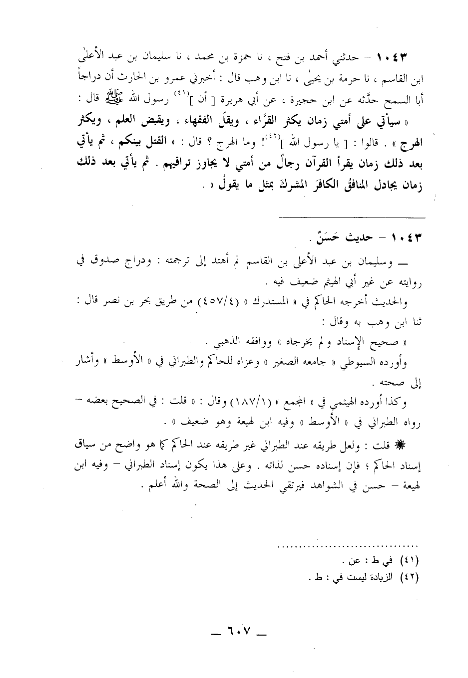 1043 - حَدَّثَنِي أَحْمَدُ بْنُ فَتْحٍ، نا حَمْزَةُ بْنُ مُحَمَّدٍ، نا سُلَيْمَانُ بْنُ عَبْدِ الْأَعْلَى بْنِ الْقَاسِمِ، نا حَرْمَلَةُ بْنُ يَحْيَى، نا ابْنُ وَهْبٍ قَالَ: أَخْبَرَنِي عَمْرُو بْنُ الْحَارِثِ، أَنَّ دَرَّاجًا أَبَا السَّمْحِ، حَدَّثَهُ عَنِ ابْنِ حُجَيْرَةَ، عَنْ أَبِي هُرَيْرَةَ، أَنَّ رَسُولَ اللَّهِ صَلَّى اللَّهُ عَلَيْهِ وَسَلَّمَ قَالَ: §«سَيَأْتِي عَلَى أُمَّتِي زَمَانٌ يَكْثُرُ الْقُرَّاءُ وَيَقِلُّ الْفُقَهَاءُ وَيُقْبَضُ الْعِلْمُ وَيَكْثُرُ الْهَرْجُ» قَالُوا: يَا رَسُولَ اللَّهِ وَمَا الْهَرْجُ؟ قَالَ: «الْقَتْلُ بَيْنَكُمْ ثُمَّ يَأْتِي بَعْدَ ذَلِكَ زَمَانٌ يَقْرَأُ الْقُرْآنَ رِجَالٌ مِنْ أُمَّتِي لَا يُجَاوِزُ تَرَاقِيَهُمْ ثُمَّ يَأْتِي بَعْدَ ذَلِكَ زَمَانٌ يُجَادِلُ الْمُنَافِقُ الْكَافِرَ الْمُشْرِكَ بِمِثْلِ مَا يَقُولُ»