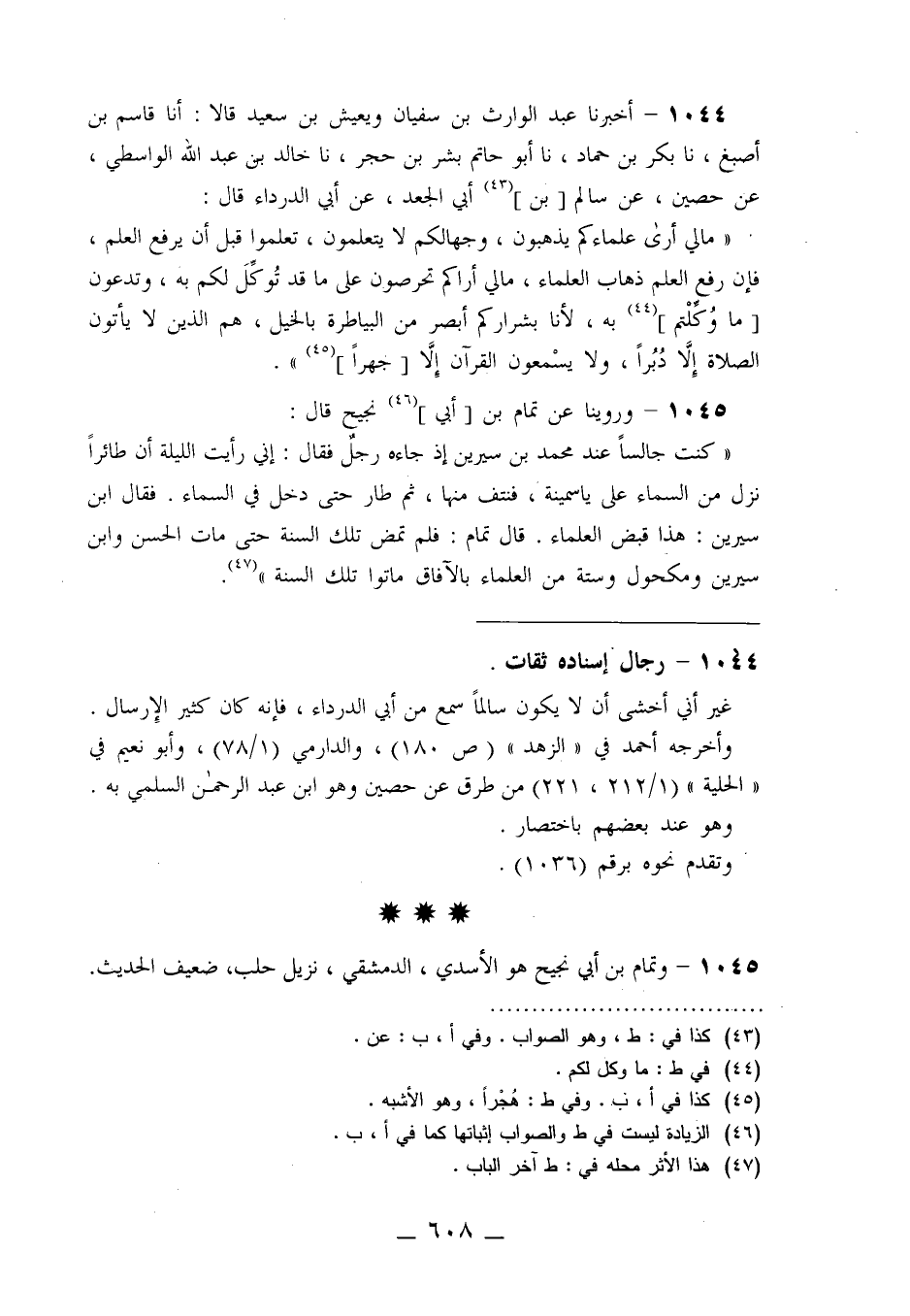 1044 - أَخْبَرَنَا عَبْدُ الْوَارِثِ بْنُ سُفْيَانَ، وَيَعِيشُ بْنُ سَعِيدٍ قَالَا: أنا قَاسِمُ بْنُ أَصْبَغَ، نا بَكْرُ بْنُ حَمَّادٍ، نا أَبُو حَاتِمٍ بِشْرُ بْنُ حُجْرٍ، نا خَالِدُ بْنُ عَبْدِ اللَّهِ الْوَاسِطِيُّ، عَنْ حُصَيْنٍ، عَنْ سَالِمِ بْنِ أَبِي الْجَعْدِ، عَنْ أَبِي الدَّرْدَاءِ قَالَ: §«مَا لِي أَرَى عُلَمَاءَكُمْ يَذْهَبُونَ وَجُهَّالَكُمْ لَا يَتَعَلَّمُونَ؟ تَعَلَّمُوا قَبْلَ أَنْ يُرْفَعَ الْعِلْمُ، فَإِنَّ رَفْعَ الْعِلْمِ ذَهَابُ الْعُلَمَاءِ، مَا لِي أَرَاكُمْ تَحْرُصُونَ عَلَى مَا قَدْ تُوُكِّلَ لَكُمْ بِهِ وَتَدَعُونَ مَا وُكِّلْتُمْ بِهِ، لَأَنَا بِشِرَارِكُمْ أَبْصَرُ مِنَ الْبَيَاطِرَةِ بِالْخَيْلِ، هُمُ الَّذِينَ لَا يَأْتُونَ الصَّلَاةَ إِلَّا دُبُرًا وَلَا يَسْمَعُونَ الْقُرْآنَ إِلَّا جَهْرًا»