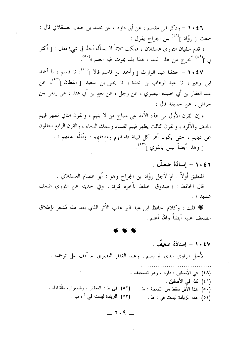 1047 - حَدَّثَنَا عَبْدُ الْوَارِثِ وَأَحْمَدُ بْنُ قَاسِمٍ قَالَا: نا قَاسِمُ نا أَحْمَدُ بْنُ زُهَيْرٍ، نا عَبْدُ الْوَهَّابِ بْنُ نَجْدَةَ، نا يَحْيَى بْنُ سَعِيدٍ الْقَطَّانُ، عَنْ عَبْدِ الْغَفَّارِ بْنِ أَبِي خُلَيْدَةَ الْبَصْرِيِّ، عَنْ رَجُلٍ، عَنْ نُعَيْمِ بْنِ أَبِي هِنْدٍ، عَنْ رِبْعِيِّ بْنِ حِرَاشٍ، عَنْ حُذَيْفَةَ قَالَ: «إِنَّ §الْقَرْنَ الْأَوَّلَ مِنْ هَذِهِ الْأُمَّةِ عَلَى مِنْهَاجِ مَنْ لَا يُتَّهَمُ، وَالْقَرْنَ الثَّانِيَ تَظْهَرُ فِيهِمُ الْحَيْفُ وَالْأَثَرَةُ، وَالْقَرْنَ الثَّالِثَ يَظْهَرُ فِيهِمُ الْفَسَادُ وَسَفْكُ الدِّمَاءِ وَالْقَرْنَ الرَّابِعَ يَنْتَقِلُونَ عَنْ دِينِهِمْ حَتَّى يَكُونَ أَعَزَّ كُلِّ قَبِيلَةٍ فَاسِقُهُمْ وَمُنَافِقُهُمْ وَأَذَلَّهُ عَالِمُهُمْ» وَهَذَا أَيْضًا لَيْسَ بِالْقَوِيِّ