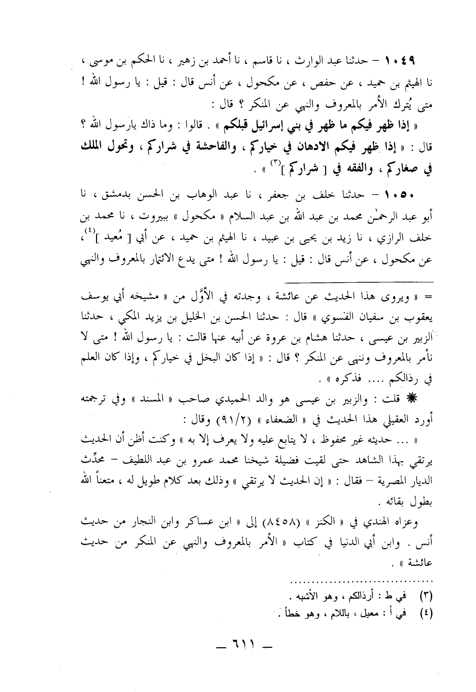 1049 - حَدَّثَنَا عَبْدُ الْوَارِثِ، نا قَاسِمٌ، نا أَحْمَدُ بْنُ زُهَيْرٍ، نا الْحَكَمُ بْنُ مُوسَى، نا الْهَيْثَمُ بْنُ حُمَيْدٍ، عَنْ حَفْصٍ، عَنْ مَكْحُولٍ، عَنْ أَنَسٍ قَالَ: قِيلَ: يَا رَسُولَ اللَّهِ، مَتَى §يُتْرَكُ الْأَمْرُ بِالْمَعْرُوفِ وَالنَّهْيُ عَنِ الْمُنْكَرِ؟ قَالَ: «إِذَا ظَهَرَ فِيكُمْ مَا ظَهَرَ فِي بَنِي إِسْرَائِيلَ قَبْلَكُمْ» قَالُوا: وَمَا ذَاكَ يَا رَسُولَ اللَّهِ؟ قَالَ: «إِذَا ظَهَرَ فِيكُمُ الْإِدْهَانُ فِي خِيَارِكُمْ وَالْفَاحِشَةُ فِي شِرَارِكُمْ وَتَحَوُّلُ الْمُلْكِ فِي صِغَارِكُمْ وَالْفِقْهُ فِي شِرَارِكُمْ»