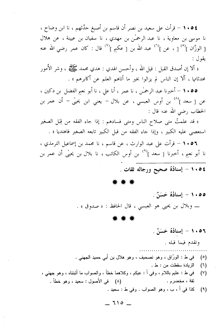 1054 - قَرَأْتُ عَلَى سَعِيدِ بْنِ نَصْرٍ، أَنَّ قَاسِمَ بْنَ أَصْبَغَ حَدَّثَهُمْ، نا ابْنُ وَضَّاحٍ، نا مُوسَى بْنُ مُعَاوِيَةَ، نا عَبْدُ الرَّحْمَنِ بْنُ مَهْدِيٍّ، نا سُفْيَانُ بْنُ عُيَيْنَةَ، عَنْ هِلَالٍ الْوَزَّانِ، عَنْ عَبْدِ اللَّهِ بْنِ عُكَيْمٍ قَالَ: كَانَ عُمَرُ رَضِيَ اللَّهُ عَنْهُ، يَقُولُ: «أَلَا إِنَّ أَصْدَقَ الْقِيلِ قِيلُ اللَّهِ، وَأَحْسَنَ الْهَدْيِ هَدْيُ مُحَمَّدٍ صَلَّى اللَّهُ عَلَيْهِ وَسَلَّمَ وَشَرَّ الْأُمُورِ مُحْدَثَاتُهَا، أَلَا إِنَّ §النَّاسَ لَمْ يَزَالُوا بِخَيْرٍ مَا أَتَاهُمُ الْعِلْمُ عَنْ أَكَابِرِهِمْ»