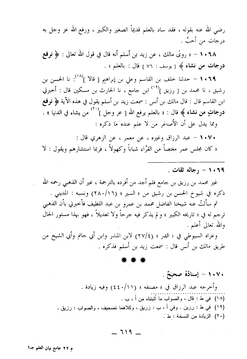 1069 - حَدَّثَنَا خَلَفُ بْنُ الْقَاسِمِ، وَعَلِيُّ بْنُ إِبْرَاهِيمَ قَالَا: نا الْحَسَنُ بْنُ رَشِيقٍ، نا مُحَمَّدُ بْنُ رُزَيقِ بْنِ جَامِعٍ، نا الْحَارِثُ بْنُ مِسْكِينٍ، قَالَ: أَخْبَرَنِي ابْنُ الْقَاسِمِ قَالَ: قَالَ مَالِكُ بْنُ أَنَسٍ، سَمِعْتُ زَيْدَ بْنَ أَسْلَمَ يَقُولُ فِي هَذِهِ الْآيَةِ {§نَرْفَعُ دَرَجَاتٍ مَنْ نَشَاءُ} [الأنعام: 83] قَالَ: «بِالْعِلْمِ يَرْفَعُ اللَّهُ عَزَّ وَجَلَّ مَنْ يَشَاءُ فِي الدُّنْيَا» وَمِمَّا يَدُلُّ عَلَى أَنَّ الْأَصَاغِرَ مَا لَا عِلْمَ عِنْدَهُ