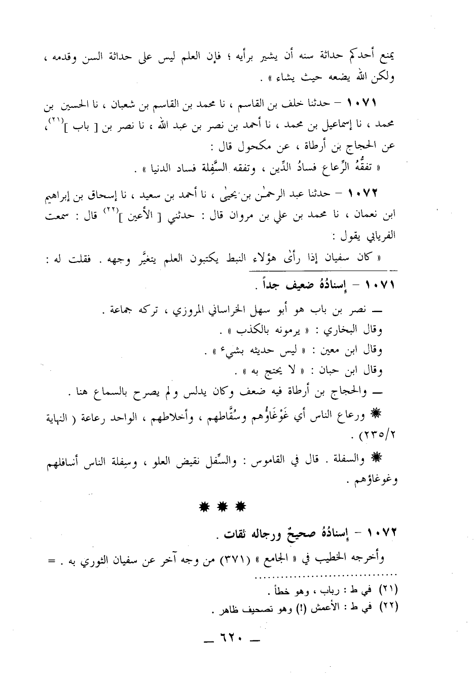 1071 - حَدَّثَنَا خَلَفُ بْنُ قَاسِمٍ، نا مُحَمَّدُ بْنُ الْقَاسِمِ بْنِ شَعْبَانَ، نا الْحُسَيْنُ بْنُ مُحَمَّدٍ، نا إِسْمَاعِيلُ بْنُ مُحَمَّدٍ، نا أَحْمَدُ بْنُ نَصْرِ بْنِ عَبْدِ اللَّهِ، نا نَصْرُ بْنُ بَابٍ عَنِ الْحَجَّاجِ بْنِ أَرْطَأَةَ، عَنْ مَكْحُولٍ قَالَ: «§تَفَقُّهُ الرِّعَاعِ فَسَادُ الدِّينِ، وَتَفَقُّهُ السَّفِلَةِ فَسَادُ الدُّنْيَا»