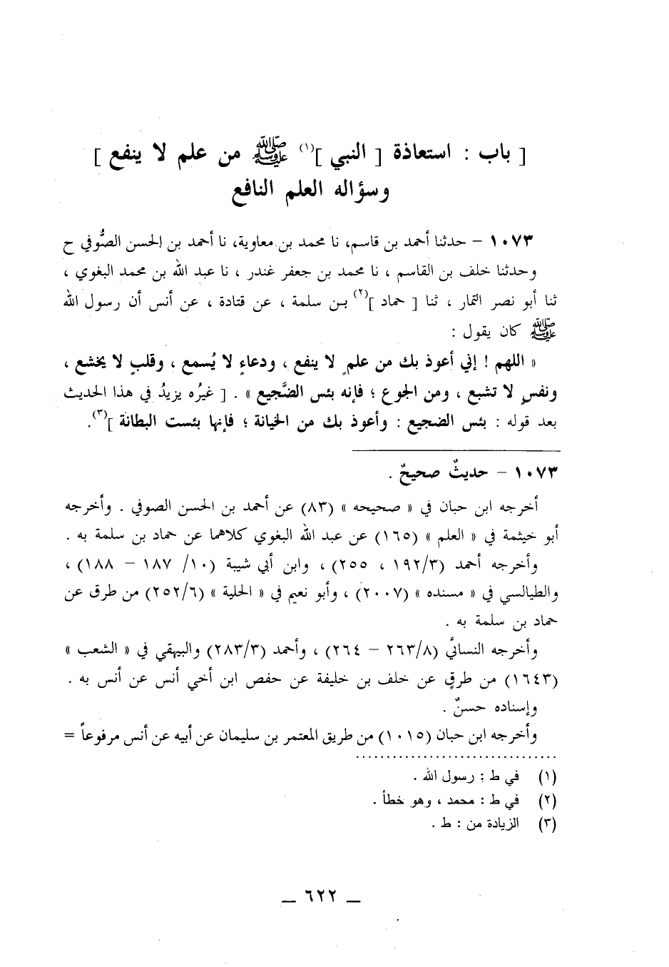 1073 - حَدَّثَنَا أَحْمَدُ بْنُ قَاسِمٍ، نا مُحَمَّدُ بْنُ مُعَاوِيَةَ، نا أَحْمَدُ بْنُ الْحَسَنِ الصُّوفِيُّ، ح وَحَدَّثَنَا خَلَفُ بْنُ الْقَاسِمِ، نا مُحَمَّدُ بْنُ جَعْفَرٍ غُنْدَرٌ، نا عَبْدُ اللَّهِ بْنُ مُحَمَّدٍ الْبَغَوِيُّ، ثنا أَبُو نَصْرٍ التَّمَّارُ، ثنا حَمَّادُ بْنُ سَلَمَةَ، عَنْ قَتَادَةَ، عَنْ أَنَسٍ، أَنَّ رَسُولَ اللَّهِ صَلَّى اللَّهُ عَلَيْهِ وَسَلَّمَ كَانَ يَقُولُ: §«اللَّهُمَّ إِنَّى أَعُوذُ بِكَ مِنْ عِلْمٍ لَا يَنْفَعُ وَدُعَاءٍ لَا يُسْمَعُ وَقَلْبٍ لَا يَخْشَعُ وَنَفْسٍ لَا تَشْبَعُ وَمِنَ الْجُوعِ فَإِنَّهُ بِئْسَ الضَّجِيعُ» غَيْرُهُ يَزِيدُ فِي هَذَا الْحَدِيثِ بَعْدَ قَوْلِهِ «بِئْسَ الضَّجِيعُ» وَأَعُوذُ بِكَ مِنَ الْخِيَانَةِ فَإِنَّهَا بِئْسَتِ الْبِطَانَةُ "