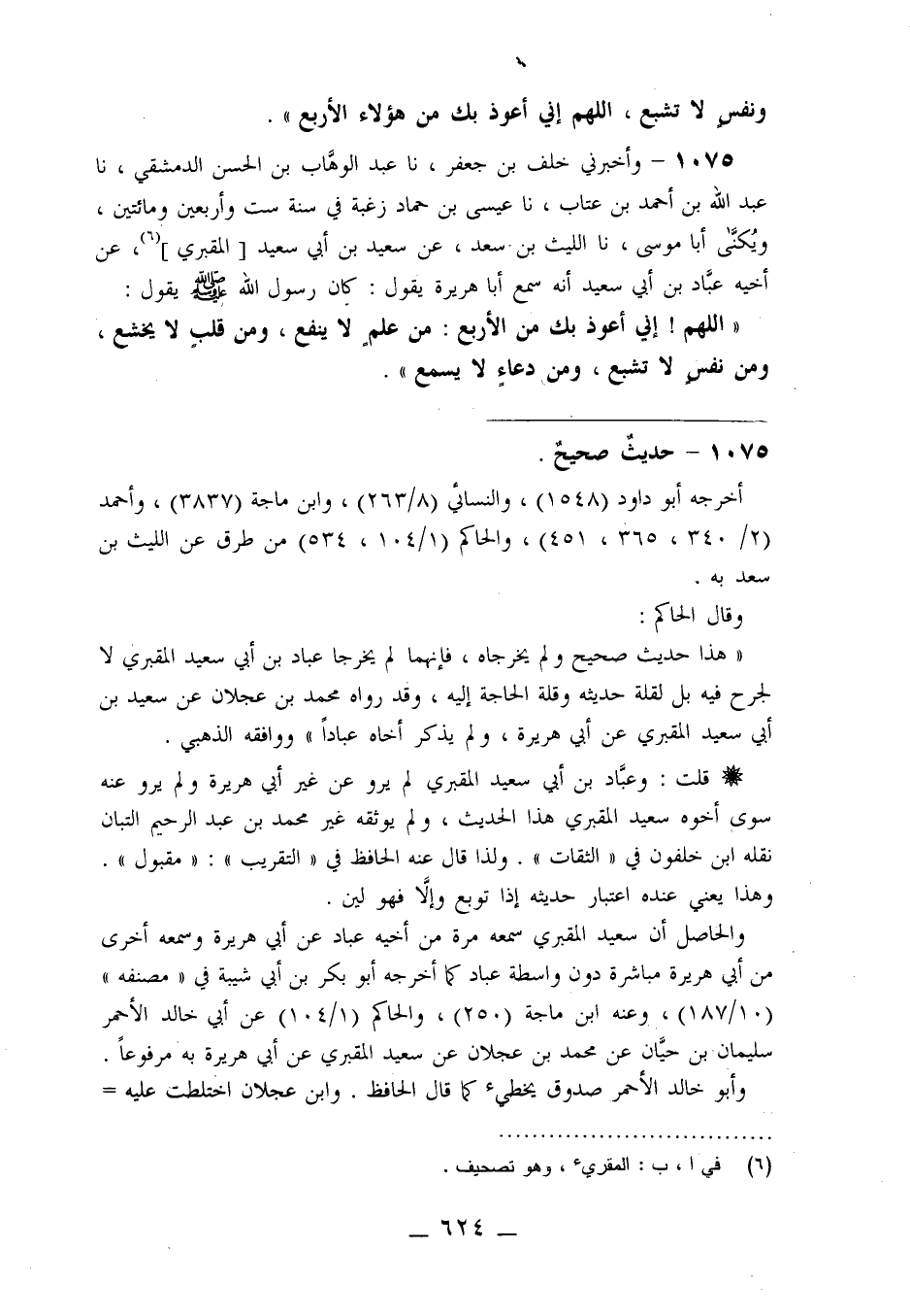 1075 - وَأَخْبَرَنِي خَلَفُ بْنُ جَعْفَرٍ، نا عَبْدُ الْوَهَّابِ بْنُ الْحَسَنِ الدِّمَشْقِيُّ، نا عَبْدُ اللَّهِ بْنُ أَحْمَدَ بْنِ عَتَّابٍ، نا عِيسَى بْنُ حَمَّادٍ زُغْبَةُ فِي سَنَةِ سِتٍّ وَأَرْبَعِينَ وَمِائَتَيْنِ وَيُكَنَّى أَبَا مُوسَى نا اللَّيْثُ بْنُ سَعْدٍ، عَنْ سَعِيدِ بْنِ أَبِي سَعِيدٍ الْمَقْبُرِيِّ، عَنْ أَخِيهِ عَبَّادِ بْنِ أَبِي سَعِيدٍ، أَنَّهُ سَمِعَ أَبَا هُرَيْرَةَ يَقُولُ: كَانَ رَسُولُ اللَّهِ صَلَّى اللَّهُ عَلَيْهِ وَسَلَّمَ يَقُولُ: " §اللَّهُمَّ إِنَّى أَعُوذُ بِكَ مِنَ الْأَرْبَعِ: مِنْ عِلْمٍ لَا يَنْفَعُ وَمِنْ قَلْبٍ لَا يَخْشَعُ وَمِنْ نَفْسٍ لَا تَشْبَعُ وَمِنْ دُعَاءٍ لَا يُسْمَعُ "