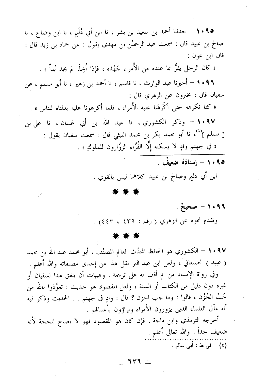 1097 - وَذَكَرَ الْكَشْوَرِيُّ، نا عَبْدُ اللَّهِ بْنُ أَبِي غَسَّانَ، نا عَلِيُّ بْنُ مُسْلِمٍ، نا أَبُو مُحَمَّدٍ بَكْرُ بْنُ مُحَمَّدٍ اللَّيْثِيُّ قَالَ: سَمِعْتُ سُفْيَانَ يَقُولُ: §«فِي جَهَنَّمَ وَادٍ لَا يَسْكُنُهُ إِلَّا الْقُرَّاءُ الزَّوَّارُونَ لِلْمُلُوكِ»