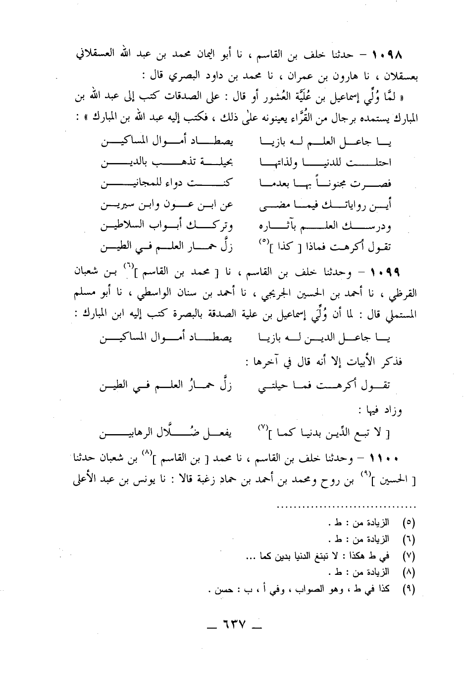 1099 - وَحَدَّثَنَا خَلَفُ بْنُ الْقَاسِمِ، نا مُحَمَّدُ بْنُ الْقَاسِمِ بْنِ شَعْبَانَ الْقُرْطُبِيُّ، نا أَحْمَدُ بْنُ الْحُسَيْنِ الْجُرَيْجِيُّ، نا أَحْمَدُ بْنُ سِنَانٍ الْوَاسِطِيُّ، نا أَبُو مُسْلِمٍ الْمُسْتَمْلِيُّ قَالَ: " لَمَّا أَنْ وَلِيَ إِسْمَاعِيلُ بْنُ عُلَيَّةَ الصَّدَقَةَ بِالْبَصْرَةِ كَتَبَ إِلَيْهِ ابْنُ الْمُبَارَكِ،