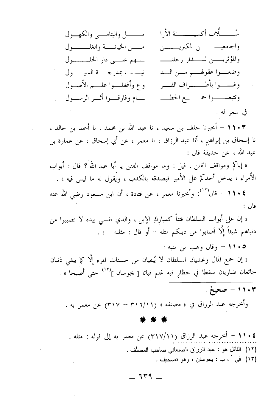 1103 - أَخْبَرَنَا خَلَفُ بْنُ سَعِيدٍ، نا عَبْدُ اللَّهِ بْنُ مُحَمَّدٍ، نا أَحْمَدُ بْنُ خَالِدٍ، نا إِسْحَاقُ بْنُ إِبْرَاهِيمَ، أنا عَبْدُ الرَّزَّاقِ، نا مَعْمَرٌ، عَنْ أَبِي إِسْحَاقَ، عَنْ عُمَارَةَ بْنِ عَبْدِ اللَّهِ، عَنْ حُذَيْفَةَ قَالَ: «§إِيَّاكُمْ وَمَوَاقِفَ الْفِتَنِ» قِيلَ: وَمَا مَوَاقِفُ الْفِتَنِ يَا أَبَا عَبْدِ اللَّهِ؟ قَالَ: «أَبْوَابُ الْأُمَرَاءِ يَدْخُلُ أَحَدُكُمْ عَلَى الْأَمِيرِ فَيُصَدِّقُهُ بِالْكَذِبِ وَيَقُولُ لَهُ مَا لَيْسَ فِيهِ»