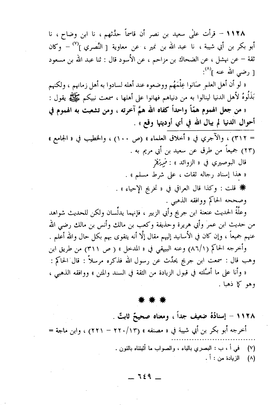 1128 - قَرَأْتُ عَلَى سَعِيدِ بْنِ نَصْرٍ، أَنَّ قَاسِمًا حَدَّثَهُمْ، نا ابْنُ وَضَّاحٍ، نا أَبُو بَكْرِ بْنُ أَبِي شَيْبَةَ، نا عَبْدُ اللَّهِ بْنُ نُمَيْرٍ، عَنْ مُعَاوِيَةَ النَّصْرِيِّ، وَكَانَ ثِقَةً عَنْ نَهْشَلٍ، عَنِ الضَّحَّاكِ بْنِ مُزَاحِمٍ، عَنِ الْأَسْوَدِ قَالَ: ثنا عَبْدُ اللَّهِ بْنُ مَسْعُودٍ رَضِيَ اللَّهُ عَنْهُ، لَوْ أَنَّ أَهْلَ الْعِلْمِ، صَانُوا عِلْمَهُمْ وَوَضَعُوهُ عِنْدَ أَهْلِهِ لَسَادُوا بِهِ أَهْلَ زَمَانِهِمْ، وَلَكِنَّهُمْ بَذَلُوهُ لِأَهْلِ الدُّنْيَا لِيَنَالُوا بِهِ مِنْ دُنْيَاهُمْ فَهَانُوا عَلَى أَهْلِهَا سَمِعْتُ نَبِيَّكُمْ صَلَّى اللَّهُ عَلَيْهِ وَسَلَّمَ يَقُولُ: «§مَنْ جَعَلَ الْهُمُومَ هَمًّا وَاحِدًا كَفَاهُ اللَّهُ هَمَّ آخِرَتِهِ، وَمَنْ تَشَعَّبَتْ بِهِ الْهُمُومُ فِي أَحْوَالِ الدُّنْيَا لَمْ يُبَالِ اللَّهُ فِي أَيِّ أَوْدِيَتِهَا وَقَعَ»