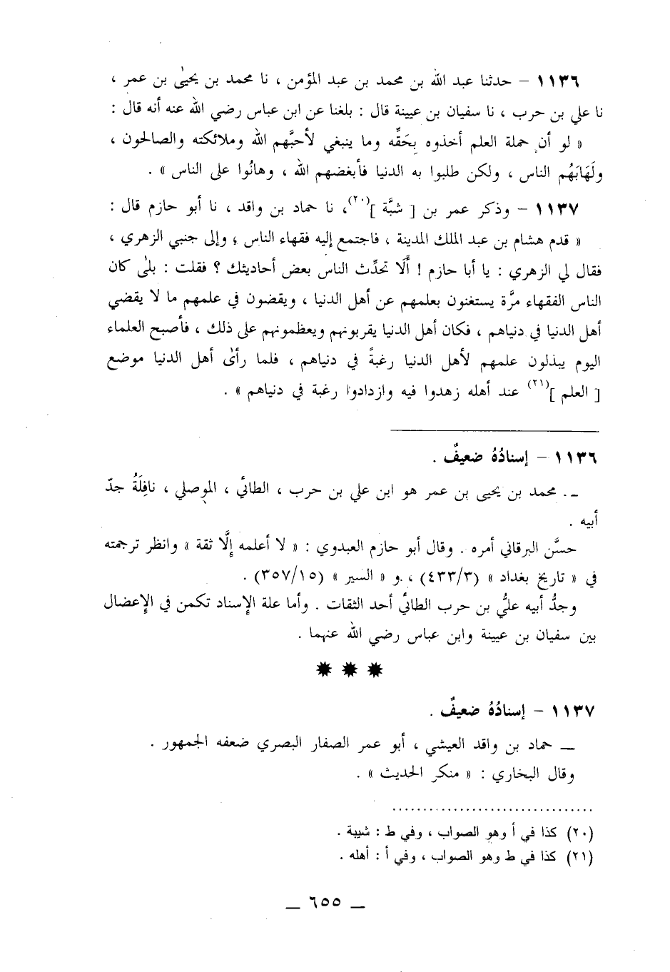 1137 - وَذَكَرَ عُمَرُ بْنُ شَبَّةَ، نا حَمَّادُ بْنُ وَاقِدٍ، نا أَبُو حَازِمٍ قَالَ: " قَدِمَ هِشَامُ بْنُ عَبْدِ الْمَلِكِ الْمَدِينَةَ فَاجْتَمَعَ إِلَيْهِ فُقَهَاءُ النَّاسِ وَإِلَى جَنْبِي الزُّهْرِيُّ فَقَالَ لِيَ الزُّهْرِيُّ: يَا أَبَا حَازِمٍ أَلَا تُحَدِّثُ النَّاسَ بَعْضَ أَحَادِيثِكَ؟ فَقُلْتُ: بَلَى كَانَ §النَّاسُ الْفُقَهَاءُ مَرَّةً يَسْتَغْنُونَ بِعِلْمِهِمْ عَنْ أَهْلِ الدُّنْيَا، وَيَقْضُونَ فِي عِلْمِهِمْ مَا لَا يَقْضِي أَهْلُ الدُّنْيَا فِي دُنْيَاهُمْ، فَكَانَ أَهْلُ الدُّنْيَا يُقَرِّبُونَهُمْ وَيُعَظِّمُونَهُمْ عَلَى ذَلِكَ، فَأَصْبَحَ الْعُلَمَاءُ الْيَوْمَ يَبْذُلُونَ عِلْمَهُمْ لِأَهْلِ الدُّنْيَا رَغْبَةً فِي دُنْيَاهُمْ، فَلَمَّا رَأَى أَهْلُ الدُّنْيَا مَوْضِعَ الْعِلْمِ عِنْدَ أَهْلِهِ زَهِدُوا فِيهِ وَازْدَادُوا رَغْبَةً فِي دُنْيَاهُمْ «-[656]-»