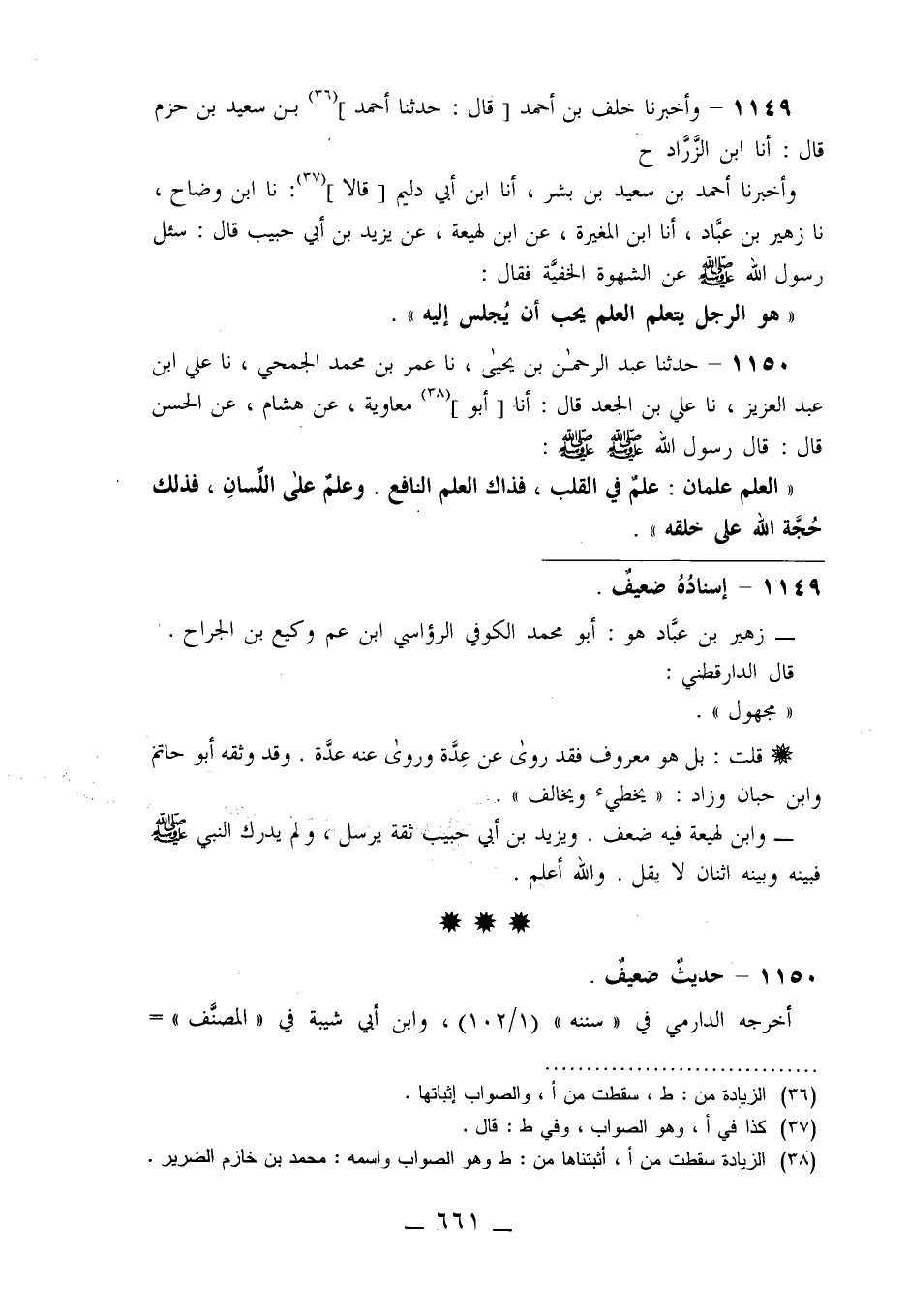 1150 - حَدَّثَنَا عَبْدُ الرَّحْمَنِ بْنُ يَحْيَى، نا عُمَرُ بْنُ مُحَمَّدٍ الْجُمَحِيُّ، نا عَلِيُّ بْنُ عَبْدِ الْعَزِيزِ، نا عَلِيُّ بْنُ الْجَعْدِ قَالَ: أنا أَبُو مُعَاوِيَةَ، عَنْ هِشَامٍ، عَنِ الْحَسَنِ قَالَ: قَالَ رَسُولُ اللَّهِ صَلَّى اللَّهُ عَلَيْهِ وَسَلَّمَ: «§الْعِلْمُ عِلْمَانِ عِلْمٌ فِي الْقَلْبِ فَذَاكَ الْعِلْمُ النَّافِعُ، وَعِلْمٌ عَلَى اللِّسَانِ فَذَلِكَ حُجَّةُ اللَّهِ عَلَى خَلْقِهِ» -[662]-