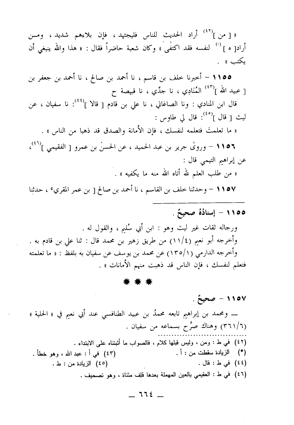 1155 - أَخْبَرَنَا خَلَفُ بْنُ الْقَاسِمِ، نا أَحْمَدُ بْنُ صَالِحٍ، نا أَحْمَدُ بْنُ جَعْفَرِ بْنِ عُبَيْدِ اللَّهِ الْمُنَادِي، نا جَدِّي، نا قَبِيصَةُ، ح قَالَ ابْنُ الْمُنَادِي، وَنا الصَّاغَانِيُّ، نا عَلِيُّ بْنُ قَادِمٍ قَالَا: نا سُفْيَانُ، عَنْ لَيْثٍ قَالَ: قَالَ لِي طَاوُسٌ، «§مَا تَعَلَّمْتَ فَتَعَلَّمْهُ لِنَفْسِكَ، فَإِنَّ الْأَمَانَةَ وَالصِّدْقَ قَدْ ذَهَبَا مِنَ النَّاسِ»