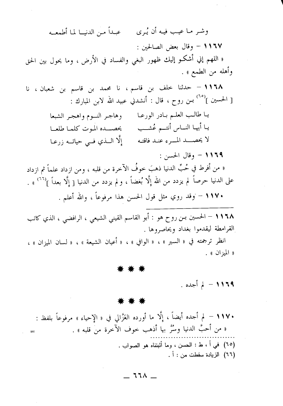 1169 - وَقَالَ الْحَسَنُ: «مَنْ أَفْرَطَ فِي حُبِّ الدُّنْيَا ذَهَبَ خَوْفُ الْآخِرَةِ مِنْ قَلْبِهِ، وَمَنِ ازْدَادَ عِلْمًا ثُمَّ ازْدَادَ عَلَى الدُّنْيَا حِرْصًا لَمْ يَزْدَدْ مِنَ اللَّهِ إِلَّا بُغْضًا وَلَمْ يَزْدَدْ مِنَ الدُّنْيَا إِلَّا بُعْدًا»