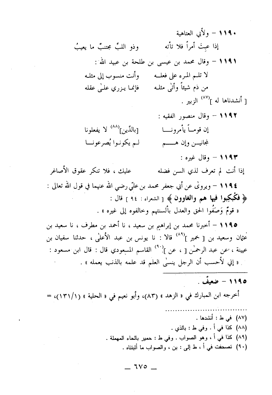 1195 - أَخْبَرَنَا مُحَمَّدُ بْنُ إِبْرَهِيمَ بْنِ سَعِيدٍ، نا أَحْمَدُ بْنُ مُطَرِّفٍ، نا سَعِيدُ بْنُ عُثْمَانَ، وَسَعِيدُ بْنُ خُمَيْرٍ قَالَا: نا يُونُسُ بْنُ عَبْدِ الْأَعْلَى، حَدَّثَنَا سُفْيَانُ بْنُ عُيَيْنَةَ، عَنْ عَبْدِ الرَّحْمَنِ عَنِ الْقَاسِمِ الْمَسْعُودِيِّ قَالَ: قَالَ ابْنُ مَسْعُودٍ: «إِنِّي §لَأَحْسَبُ أَنَّ الرَّجُلَ يَنْسَى الْعِلْمَ قَدْ عَلِمَهُ بِالذَّنْبِ يَعْمَلَهُ» -[676]-