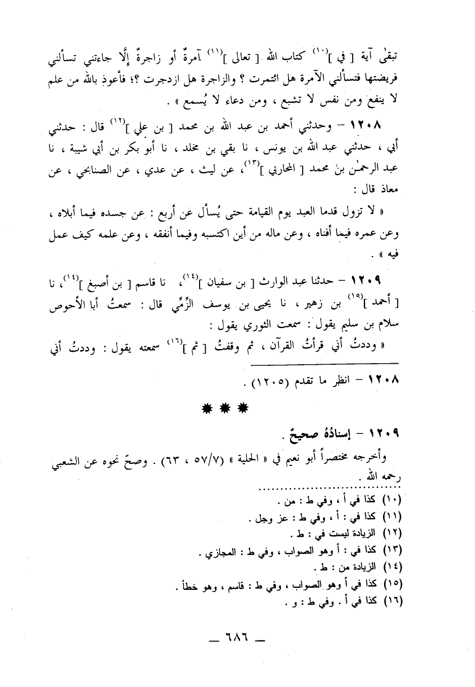 1208 - وَحَدَّثَنِي أَحْمَدُ بْنُ عَبْدِ اللَّهِ بْنِ مُحَمَّدِ بْنِ عَلِيٍّ قَالَ: حَدَّثَنِي أَبِي، حَدَّثَنِي عَبْدُ اللَّهِ بْنُ يُونُسَ، نا بَقِيُّ بْنُ مَخْلَدٍ، نا أَبُو بَكْرِ بْنُ أَبِي شَيْبَةَ، نا عَبْدُ الرَّحْمَنِ بْنُ مُحَمَّدٍ الْمُحَارِبِيُّ، عَنْ لَيْثٍ، عَنْ عَدِيٍّ، عَنِ الصُّنَابِحِيّ، عَنْ مُعَاذٍ قَالَ: §«لَا تَزُولُ قَدَمَا الْعَبْدِ يَوْمَ الْقِيَامَةِ حَتَّى يُسْأَلَ عَنْ أَرْبَعٍ، عَنْ جَسَدِهِ فِيمَا أَبْلَاهُ، وَعَنْ عُمُرِهِ فِيمَا أَفْنَاهُ، وَعَنْ مَالِهِ مِنْ أَيْنَ اكْتَسَبَهُ؟ وَفِيمَا أَنْفَقَهُ، وَعَنْ عِلْمِهِ كَيْفَ عَمِلَ فِيهِ»