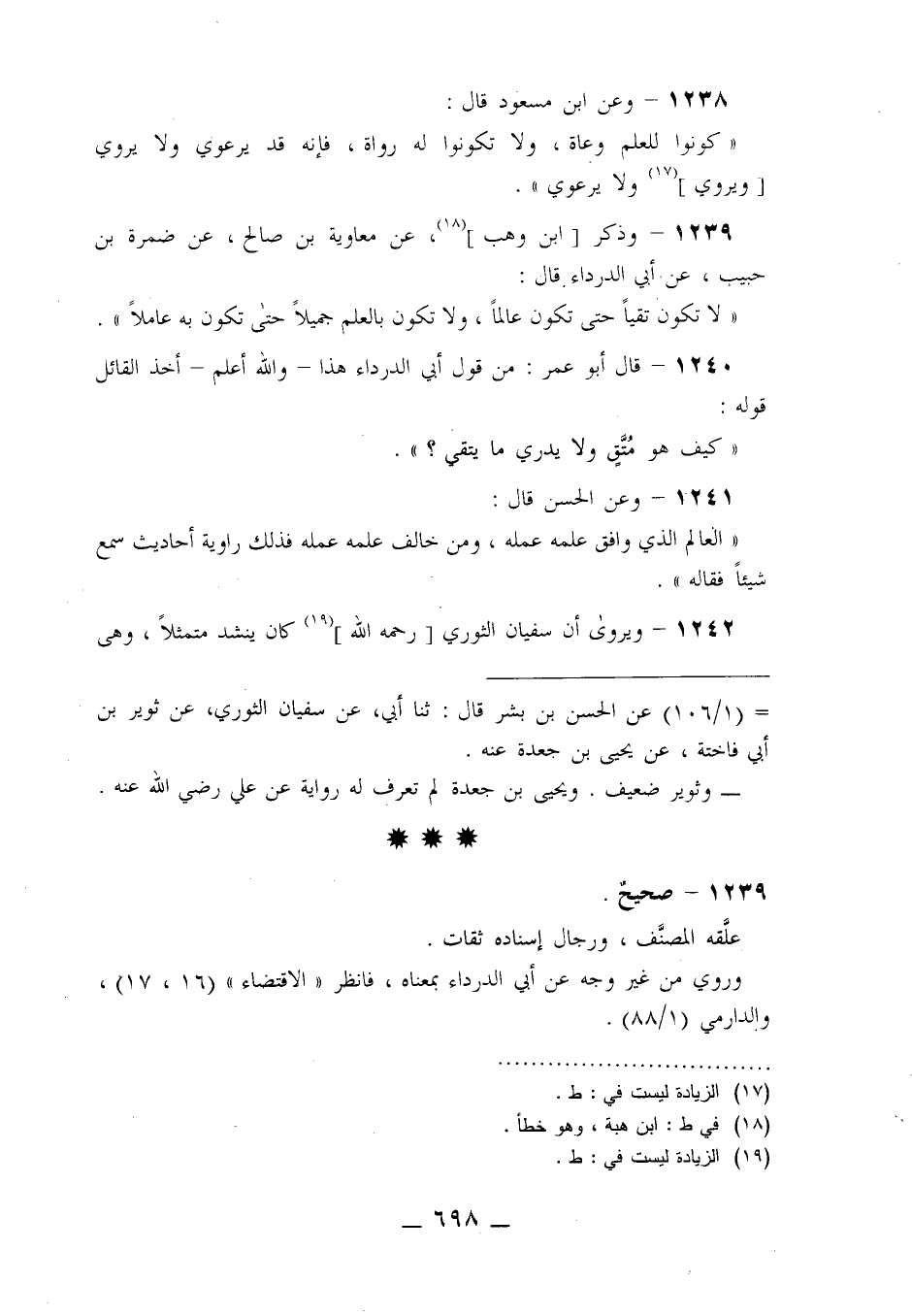 1239 - وَذَكَرَ ابْنُ وَهَبٍ، عَنْ مُعَاوِيَةَ بْنِ صَالِحٍ، عَنْ ضَمْرَةَ بْنِ حَبِيبٍ، عَنْ أَبِي الدَّرْدَاءِ قَالَ: §«لَا تَكُونُ تَقِيًّا حَتَّى تَكُونَ عَالِمًا وَلَا تَكُونُ بِالْعِلْمِ جَمِيلًا حَتَّى تَكُونَ بِهِ عَامِلًا»