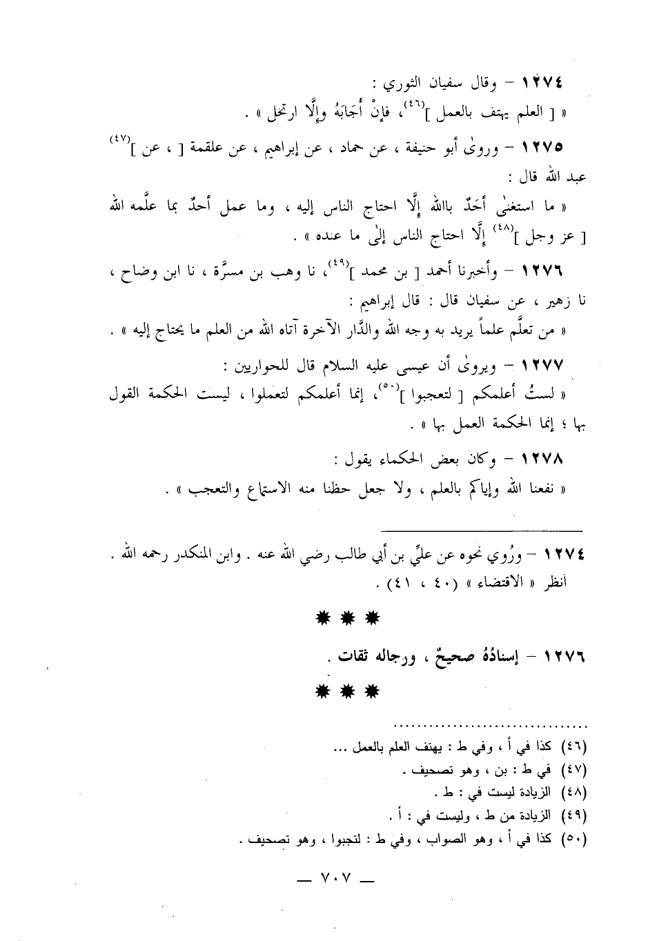 1275 - وَرَوَى أَبُو حَنِيفَةَ، عَنْ حَمَّادٍ، عَنْ إِبْرَاهِيمَ، عَنْ عَلْقَمَةَ، عَنْ عَبْدِ اللَّهِ قَالَ: «§مَا اسْتَغْنَى أَحَدٌ بِاللَّهِ إِلَّا احْتَاجَ النَّاسُ إِلَيْهِ، وَمَا عَمِلَ أَحَدٌ بِمَا عَلَّمَهُ اللَّهُ عَزَّ وَجَلَّ إِلَّا احْتَاجَ النَّاسُ إِلَى مَا عِنْدَهُ»