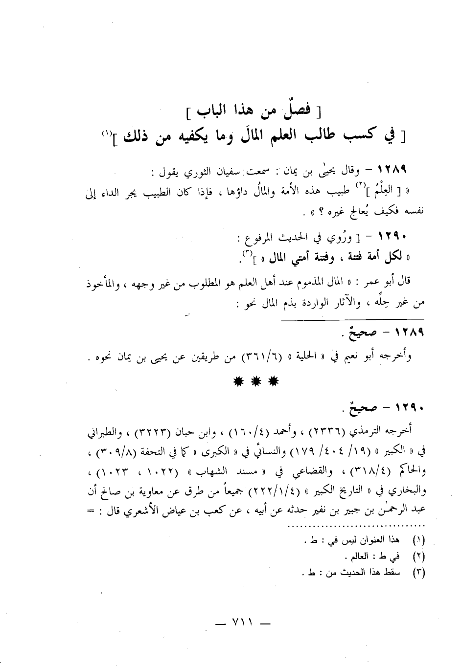 1289 - وَقَالَ يَحْيَى بْنُ يَمَانٍ: سَمِعْتُ سُفْيَانَ الثَّوْرِيَّ يَقُولُ: §«الْعِلْمُ طَبِيبُ هَذِهِ الْأُمَّةِ وَالْمَالُ دَاؤُهَا فَإِذَا كَانَ الطَّبِيبُ يَجُرُّ الدَّاءَ إِلَى نَفْسِهِ فَكَيْفَ يُعَالِجُ غَيْرَهُ؟»