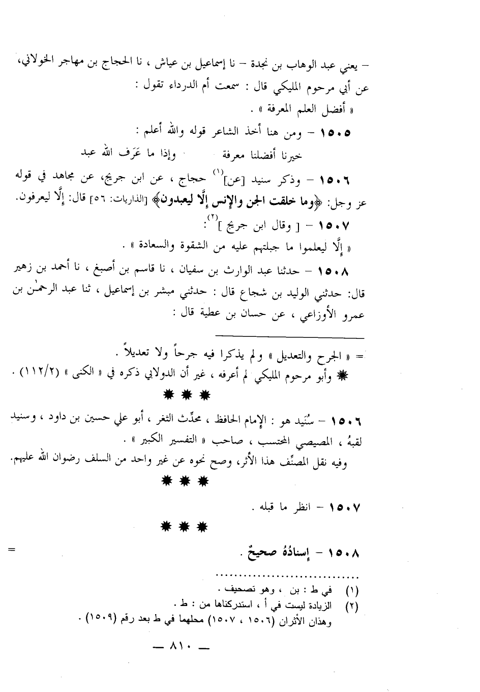 1506 - وَذَكَرَ سُنَيْدٌ عَنِ حَجَّاجٍ، عَنِ ابْنِ جُرَيْجٍ، عَنْ مُجَاهِدٍ فِي قَوْلِهِ عَزَّ وَجَلَّ {§وَمَا خَلَقْتُ الْجِنَّ وَالْإِنْسَ إِلَّا لِيَعْبُدُونْ} [الذاريات: 56] قَالَ: «إِلَّا لِيَعْرِفُونِ»