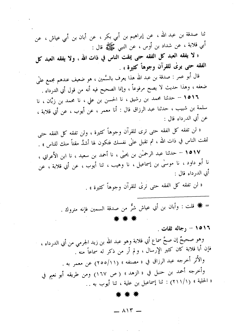 1516 - حَدَّثَنَا مُحَمَّدُ بْنُ رَشِيقٍ، نا الْحَسَنُ بْنُ عَلِيٍّ، نا مُحَمَّدُ بْنُ زَبَّانَ، نا سَلَمَةُ بْنُ شَبِيبٍ، حَدَّثنَا عَبْدُ الرَّزَّاقِ قَالَ: أنا مَعْمَرٌ، عَنْ أَيُّوبَ، عَنْ أَبِي قِلَابَةَ، عَنْ أَبِي الدَّرْدَاءِ قَالَ: «§لَنْ تَفْقَهَ كُلَّ الْفِقْهِ حَتَّى تَرَى لِلْقُرْآنِ وُجُوهًا كَثِيرَةً، وَلَنْ تَفْقَهَ كُلَّ الْفِقْهِ حَتَّى تَمْقُتَ النَّاسَ فِي ذَاتِ اللَّهِ ثُمَّ تُقْبِلُ عَلَى نَفْسِكَ فَتَكُونُ لَهَا أَشَدَّ مَقْتًا مِنْكَ لِلنَّاسِ»