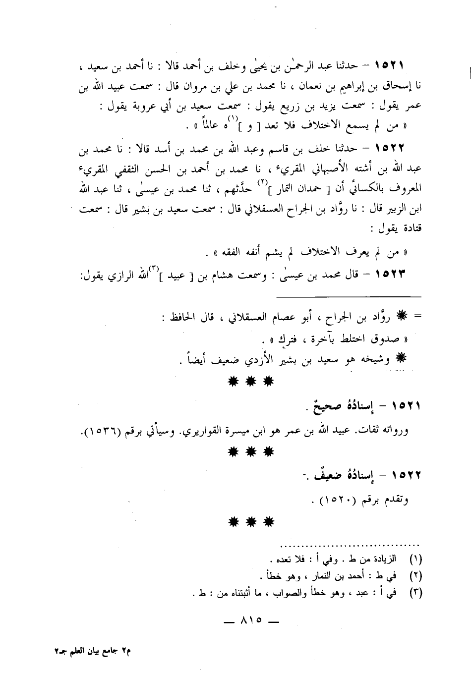 1521 - حَدَّثَنَا عَبْدُ الرَّحْمَنِ بْنُ يَحْيَى، وَخَلَفُ بْنُ أَحْمَدَ قَالَا: نا أَحْمَدُ بْنُ سَعِيدٍ، نا إِسْحَاقُ بْنُ إِبْرَاهِيمَ بْنِ نُعْمَانَ، نا مُحَمَّدُ بْنُ عَلِيِّ بْنِ مَرْوَانَ قَالَ: سَمِعْتُ عُبَيْدَ اللَّهِ بْنَ عُمَرَ يَقُولُ: سَمِعْتُ يَزِيدَ بْنِ زُرَيْعٍ يَقُولُ: سَمِعْتُ سَعِيدَ بْنَ أَبِي عَرُوبَةَ يَقُولُ: §«مَنْ لَمْ يَسْمَعِ الِاخْتِلَافَ فَلَا تَعُدُّوهُ عَالِمًا»