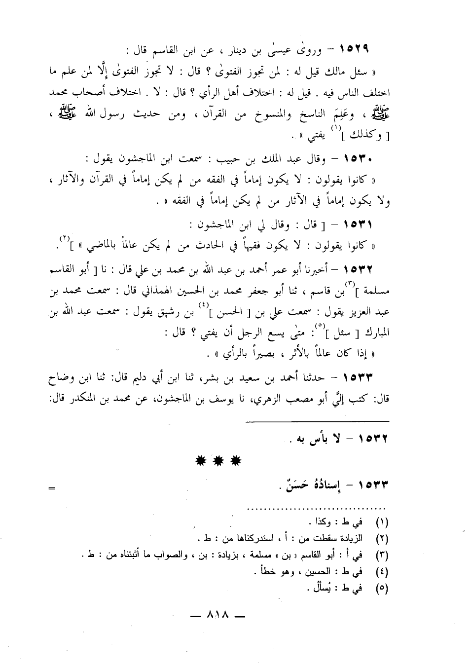 1532 - أَخْبَرَنَا أَبُو عُمَرَ أَحْمَدُ بْنُ عَبْدِ اللَّهِ بْنِ مُحَمَّدِ بْنِ عَلِيٍّ قَالَ: نا أَبُو الْقَاسِمِ مَسْلَمَةُ بْنُ قَاسِمٍ، ثنا أَبُو جَعْفَرٍ مُحَمَّدُ بْنُ الْحُسَيْنِ الْهَمْدَانِيُّ قَالَ: سَمِعْتُ مُحَمَّدَ بْنَ عَبْدِ الْعَزِيزِ يَقُولُ: سَمِعْتُ عَلِيَّ بْنَ الْحَسَنِ بْنِ شَقِيقٍ يَقُولُ: سَمِعْتُ عَبْدَ اللَّهِ بْنَ الْمُبَارَكِ سُئِلَ §مَتَى يَسَعُ الرَّجُلَ أَنْ يُفْتِيَ؟ قَالَ: «إِذَا كَانَ عَالِمًا بِالْأَثَرِ بَصِيرًا بِالرَّأْيِ»