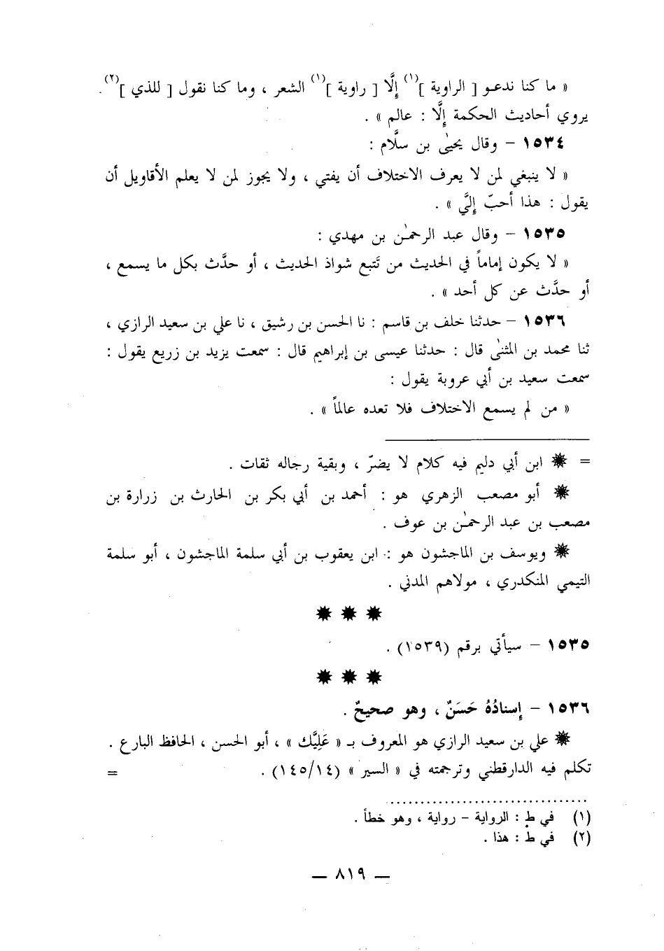 1536 - حَدَّثَنَا خَلَفُ بْنُ قَاسِمِ، نا الْحَسَنُ بْنُ رَشِيقٍ، نا عَلِيُّ بْنُ سَعِيدٍ الرَّازِيُّ، ثنا مُحَمَّدُ بْنُ الْمُثَنَّى قَالَ: حَدَّثَنَا عِيسَى بْنُ إِبْرَاهِيمَ قَالَ: سَمِعْتُ يَزِيدَ بْنِ زُرَيْعٍ يَقُولُ: سَمِعْتُ سَعِيدَ بْنَ أَبِي عَرُوبَةَ يَقُولُ: §«مَنْ لَمْ يَسْمَعِ الِاخْتِلَافَ فَلَا تَعُدَّهُ عَالِمًا»