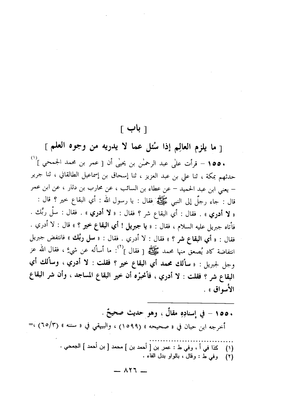 1550 - قَرَأْتُ عَلَى عَبْدِ الرَّحْمَنِ بْنِ يَحْيَى، أَنَّ عُمَرَ بْنِ مُحَمَّدِ الْجُمَحِيَّ، حَدَّثَهُمْ بِمَكَّةَ، ثنا عَلِيُّ بْنُ عَبْدِ الْعَزِيزِ، ثنا إِسْحَاقُ بْنُ إِسْمَاعِيلَ الطَّالْقَانِيُّ، ثنا جَرِيرٌ يَعْنِي ابْنَ عَبْدِ الْحَمِيدِ، عَنْ عَطَاءِ بْنِ السَّائِبِ، عَنْ مُحَارِبِ بْنِ دِثَارٍ، عَنِ ابْنِ عُمَرَ قَالَ: جَاءَ رَجُلٌ إِلَى النَّبِيِّ صَلَّى اللَّهُ عَلَيْهِ وَسَلَّمَ فَقَالَ: " يَا رَسُولَ اللَّهِ، أَيُّ الْبِقَاعِ خَيْرٌ؟ قَالَ: «لَا أَدْرِي» فَقَالَ: أَيُّ الْبِقَاعِ شَرٌّ؟ فَقَالَ: «لَا أَدْرِي» فَقَالَ: سَلْ رَبَّكَ فَآتَاهُ جِبْرِيلُ عَلَيْهِ السَّلَامُ فَقَالَ: «يَا جِبْرِيلُ، أَيُّ الْبِقَاعِ خَيْرٌ؟» قَالَ: لَا أَدْرِي فَقَالَ: «أَيُّ الْبِقَاعِ شَرٌّ» فَقَالَ: لَا أَدْرِي فَقَالَ: «سَلْ رَبَّكَ» فَانْتَفَضَ جِبْرِيلُ انْتِفَاضَةً كَادَ يُصْعَقُ مِنْهَا مُحَمَّدٌ صَلَّى اللَّهُ عَلَيْهِ وَسَلَّمَ، فَقَالَ: مَا أَسْأَلُهُ عَنْ شَيْءٍ فَقَالَ اللَّهُ عَزَّ وَجَلَّ لِجِبْرِيلَ: " سَأَلَكَ مُحَمَّدٌ أَيُّ الْبِقَاعِ خَيْرٌ؟ فَقُلْتَ: لَا أَدْرِي وَسَأَلَكَ أَيُّ الْبِقَاعِ شَرٌّ؟ فَقُلْتَ: لَا أَدْرِي فَأَخْبِرْهُ أَنَّ §خَيْرَ الْبِقَاعِ الْمَسَاجِدُ، وَأَنَّ شَرَّ الْبِقَاعِ الْأَسْوَاقُ "
