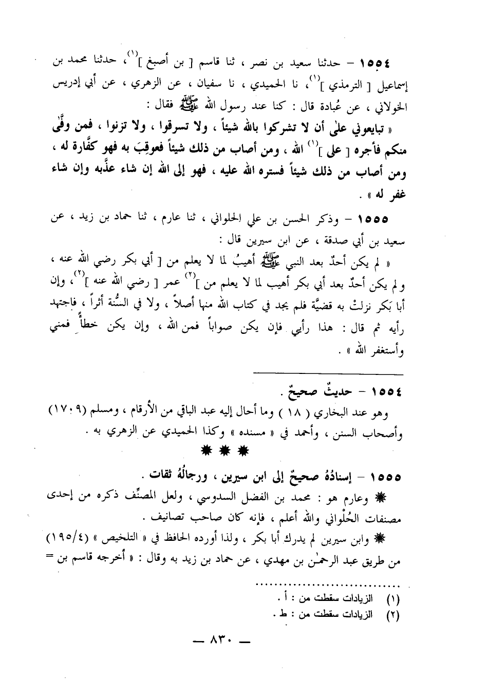 1554 - حَدَّثَنَا سَعِيدُ بْنُ نَصْرٍ، ثنا قَاسِمُ بْنُ أَصْبَغَ، حَدَّثَنَا مُحَمَّدُ بْنُ إِسْمَاعِيلَ التِّرْمِذِيُّ، نا الْحُمَيْدِيُّ، نا سُفْيَانُ، عَنِ الزُّهْرِيِّ، عَنْ أَبِي إِدْرِيسَ الْخَوْلَانِيِّ، عَنْ عُبَادَةَ قَالَ: كُنَّا عِنْدَ رَسُولِ اللَّهِ صَلَّى اللَّهُ عَلَيْهِ وَسَلَّمَ فَقَالَ §«تُبَايِعُونِي عَلَى أَنْ لَا تُشْرِكُوا بِاللَّهِ شَيْئًا وَلَا تَسْرِقُوا وَلَا تَزْنُوا، فَمَنْ وَفَّى مِنْكُمْ فَأَجْرُهُ عَلَى اللَّهِ وَمَنْ أَصَابَ مِنْ ذَلِكَ شَيْئًا فَعُوقِبَ بِهِ فَهُوَ كَفَّارَةٌ لَهُ، وَمَنْ أَصَابَ مِنْ ذَلِكَ شَيْئًا فَسَتَرَهُ اللَّهُ عَلَيْهِ فَهُوَ إِلَى اللَّهِ إِنْ شَاءَ عَذَّبَهُ وَإِنْ شَاءَ غَفَرَ لَهُ» ،