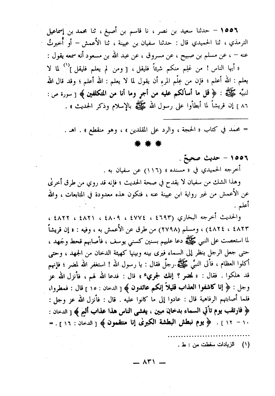 1556 - حَدَّثَنَا سَعِيدُ بْنُ نَصْرٍ، نا قَاسِمُ بْنُ أَصْبَغَ، ثنا مُحَمَّدُ بْنُ إِسْمَاعِيلَ التِّرْمِذِيُّ، ثنا الْحُمَيْدِيُّ قَالَ: حَدَّثَنَا سُفْيَانُ بْنُ عُيَيْنَةَ، ثنا الْأَعْمَشُ، أَوْ أُخْبِرْتُ عَنْهُ، عَنْ مُسْلِمِ بْنِ صُبَيْحٍ، عَنْ مَسْرُوقٍ، عَنْ عَبْدِ اللَّهِ بْنِ مَسْعُودٍ، أَنَّهُ سَمِعَهُ يَقُولُ: " أَيُّهَا النَّاسُ §مَنْ عَلِمَ مِنْكُمْ شَيْئًا فَلْيَقُلْ، وَمَنْ لَمْ يَعْلَمْ فَلْيَقُلْ لِمَا لَا يَعْلَمُ: اللَّهُ أَعْلَمُ؛ فَإِنَّ مِنْ عِلْمِ الْمَرْءِ أَنْ يَقُولَ لِمَا لَا يَعْلَمُ: اللَّهُ أَعْلَمُ، وَقَدْ قَالَ اللَّهُ لِنَبِيِّهِ صَلَّى اللَّهُ عَلَيْهِ وَسَلَّمَ {قُلْ مَا أَسْأَلُكُمْ عَلَيْهِ مِنْ أَجْرٍ وَمَا أَنَا مِنَ الْمُتَكَلِّفِينَ} [ص: 86] إِنَّ قُرَيْشًا لَمَّا أَبْطَئُوا عَلَى رَسُولِ اللَّهِ صَلَّى اللَّهُ عَلَيْهِ وَسَلَّمَ بِالْإِسْلَامِ " وَذَكَرَ الْحَدِيثَ