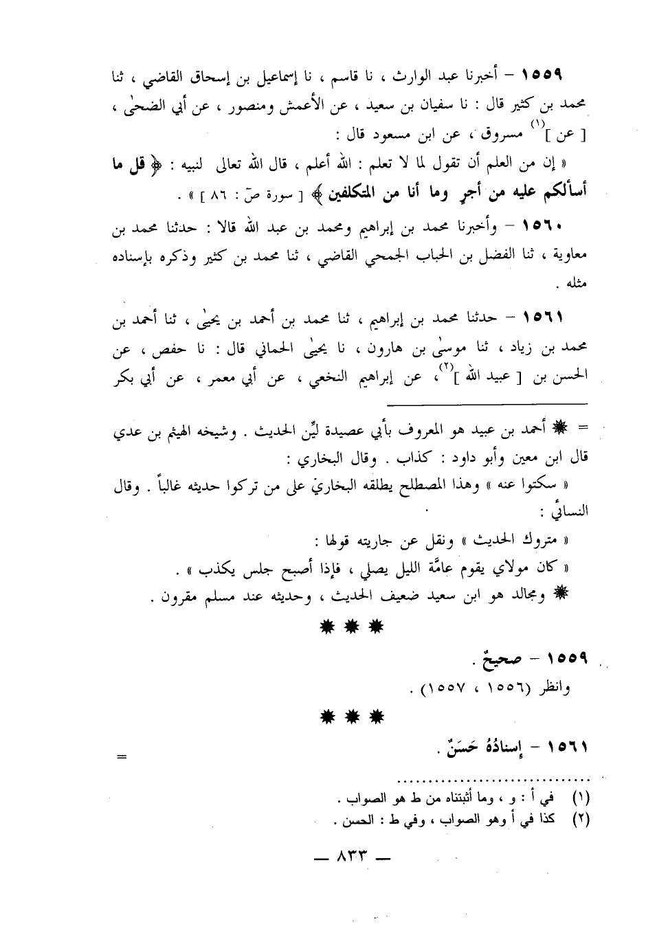 1559 - أَخْبَرَنَا عَبْدُ الْوَارِثِ، نا قَاسِمٌ، نا إِسْمَاعِيلُ بْنُ إِسْحَاقَ الْقَاضِي، ثنا مُحَمَّدُ بْنُ كَثِيرٍ، قَالَ نا سُفْيَانُ بْنُ سَعِيدٍ، عَنِ الْأَعْمَشِ، وَمَنْصُورٍ، عَنْ أَبِي الضُّحَى، عَنْ مَسْرُوقٍ، عَنِ ابْنِ مَسْعُودٍ قَالَ: " إِنَّ §مِنَ الْعِلْمِ أَنْ تَقُولَ لِمَا لَا تَعْلَمُ: اللَّهُ أَعْلَمُ، قَالَ اللَّهُ تَعَالَى لِنَبِيِّهِ {قُلْ مَا أَسْأَلُكُمْ عَلَيْهِ مِنْ أَجْرٍ وَمَا أَنَا مِنَ الْمُتَكَلِّفِينَ} [ص: 86] "