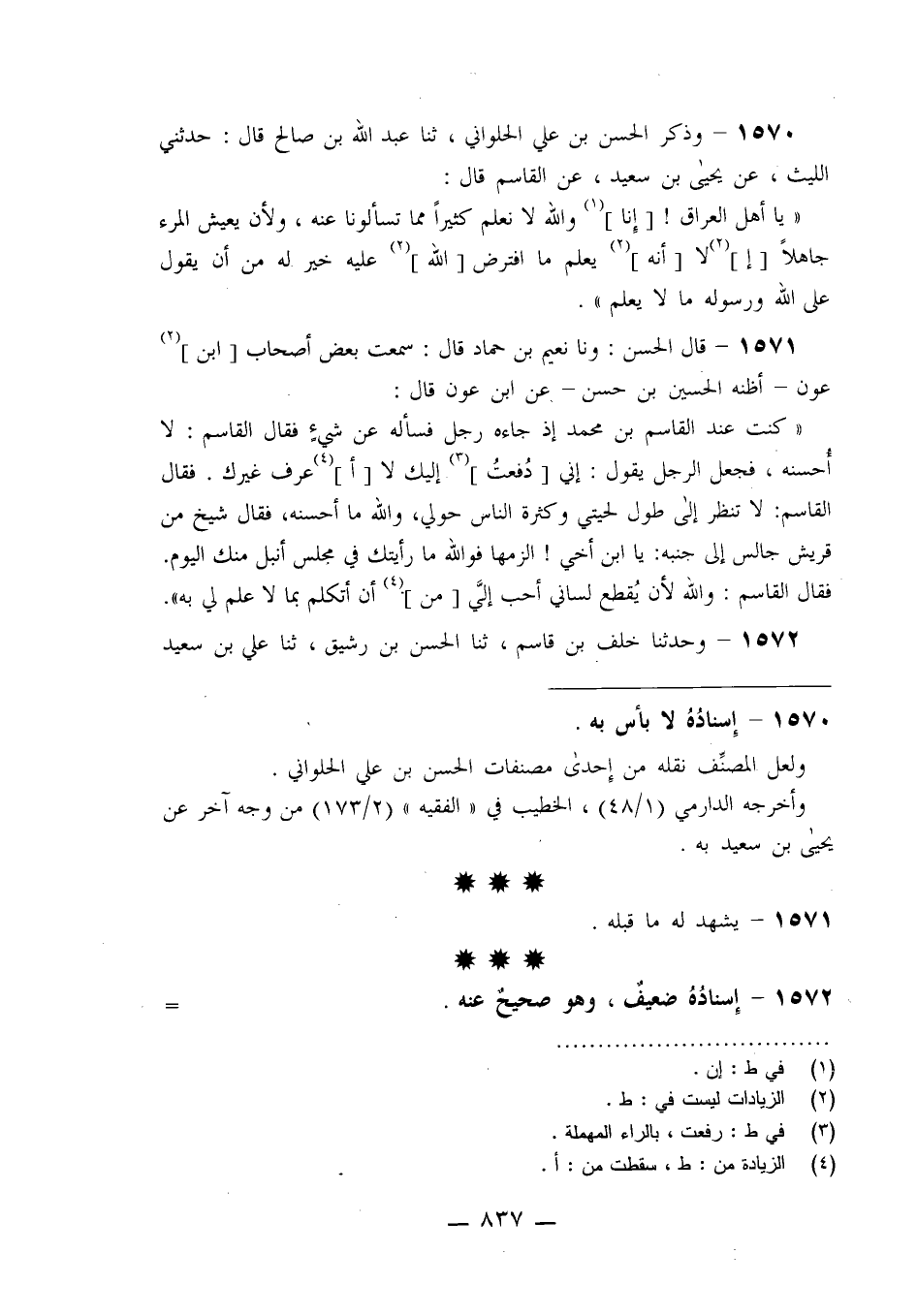 1571 - قَالَ الْحَسَنُ، وَنا نُعَيْمُ بْنُ حَمَّادٍ قَالَ: سَمِعْتُ بَعْضَ أَصْحَابِ ابْنِ عَوْنٍ أَظُنُّهُ الْحُسَيْنَ بْنَ حَسَنٍ، عَنِ ابْنِ عَوْنٍ قَالَ: كُنْتُ عِنْدَ الْقَاسِمِ بْنِ مُحَمَّدٍ إِذْ جَاءَهُ رَجُلٌ فَسَأَلَهُ عَنْ شَيْءٍ، فَقَالَ الْقَاسِمُ: «لَا أُحْسِنُهُ» فَجَعَلَ الرَّجُلُ يَقُولُ: إِنِّي دُفِعْتُ إِلَيْكَ لَا أَعْرِفُ غَيْرَكَ فَقَالَ الْقَاسِمُ: «لَا تَنْظُرْ إِلَى طُولِ لِحْيَتِي وَكَثْرَةِ النَّاسِ حَوْلِي وَاللَّهِ مَا أُحْسِنُهُ» فَقَالَ شَيْخٌ مِنْ قُرَيْشٍ جَالِسٌ إِلَى جَنْبِهِ: يَا ابْنَ أَخِي الْزَمْهَا فَوَاللَّهِ مَا رَأَيْتُكَ فِي مَجْلِسٍ أَنْبَلَ مِنْكَ الْيَوْمَ، فَقَالَ الْقَاسِمُ: «وَاللَّهِ §لَأَنْ يُقْطَعَ لِسَانِي أَحَبُّ إِلَيَّ مِنْ أَنْ أَتَكَلَّمَ بِمَا لَا عِلْمَ لِي بِهِ»