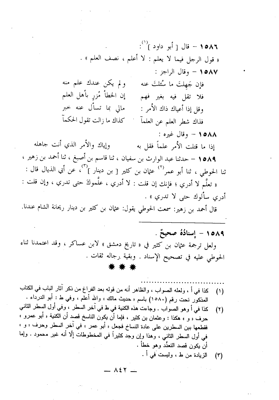 1589 - حَدَّثَنَا عَبْدُ الْوَارِثِ بْنُ سُفْيَانَ، ثنا قَاسِمُ بْنُ أَصْبَغَ، ثنا أَحْمَدُ بْنُ زُهَيْرِ، ثنا الْحَوْطِيُّ ثنا أَبُو عُمَرَ عُثْمَانُ بْنُ كَثِيرِ بْنِ دِينَارٍ، عَنْ أَبِي الذَّيَّالِ قَالَ: " §تَعَلَّمْ لَا أَدْرِي؛ فَإِنَّكَ إِنْ قُلْتَ: لَا أَدْرِي عَلَّمُوكَ حَتَّى تَدْرِيَ وَإِنْ قُلْتَ: أَدْرِي سَأَلُوكَ حَتَّى لَا تَدْرِيَ " قَالَ أَحْمَدُ بْنُ زُهَيْرٍ، سَمِعْتُ الْحَوْطِيَّ يَقُولُ: عُثْمَانُ بْنُ كَثِيرِ بْنِ دِينَارٍ، رَيْحَانَةُ الشَّامِ عِنْدَنَا