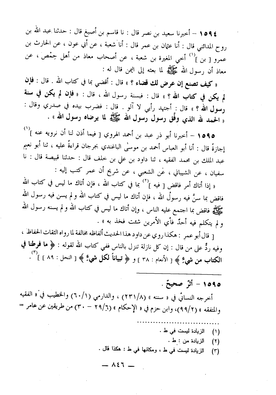 1594 - أَخْبَرَنَا سَعِيدُ بْنُ نَصْرٍ قَالَ: نا قَاسِمُ بْنُ أَصْبَغَ قَالَ: حَدَّثَنَا عَبْدُ اللَّهِ بْنُ رَوْحٍ الْمَدَائِنِيُّ قَالَ: أنا عُثْمَانُ بْنُ عُمَرَ قَالَ: أَنَا شُعْبَةُ، عَنْ أَبِي عَوْنٍ، عَنِ الْحَارِثِ بْنِ عَمْرٍو ابْنِ أَخِي الْمُغِيرَةِ بْنِ شُعْبَةَ، عَنْ أَصْحَابِ مُعَاذٍ مِنْ أَهْلِ حِمْصٍ، عَنْ مُعَاذٍ، أَنَّ رَسُولَ اللَّهِ صَلَّى اللَّهُ عَلَيْهِ وَسَلَّمَ لَمَّا بَعَثَهُ إِلَى الْيَمَنِ قَالَ لَهُ: «§كَيْفَ تَصْنَعُ إِنْ عَرَضَ لَكَ قَضَاءٌ؟» قَالَ: أَقْضِي بِمَا فِي كِتَابِ اللَّهِ قَالَ: «فَإِنْ لَمْ يَكُنْ فِي كِتَابِ اللَّهِ؟» قَالَ: فَبِسُنَّةِ رَسُولِ اللَّهِ، قَالَ: «فَإِنْ لَمْ يَكُنْ فِي سُنَّةِ رَسُولِ اللَّهِ؟» قَالَ: أَجْتَهِدُ رَأْيِي لَا آلُو قَالَ: فَضَرَبَ بِيَدِهِ فِي صَدْرِي وَقَالَ: «الْحَمْدُ لِلَّهِ الَّذِي وَفَّقَ رَسُولَ رَسُولِ اللَّهِ صَلَّى اللَّهُ عَلَيْهِ وَسَلَّمَ لِمَا يَرْضَاهُ رَسُولُ اللَّهِ»