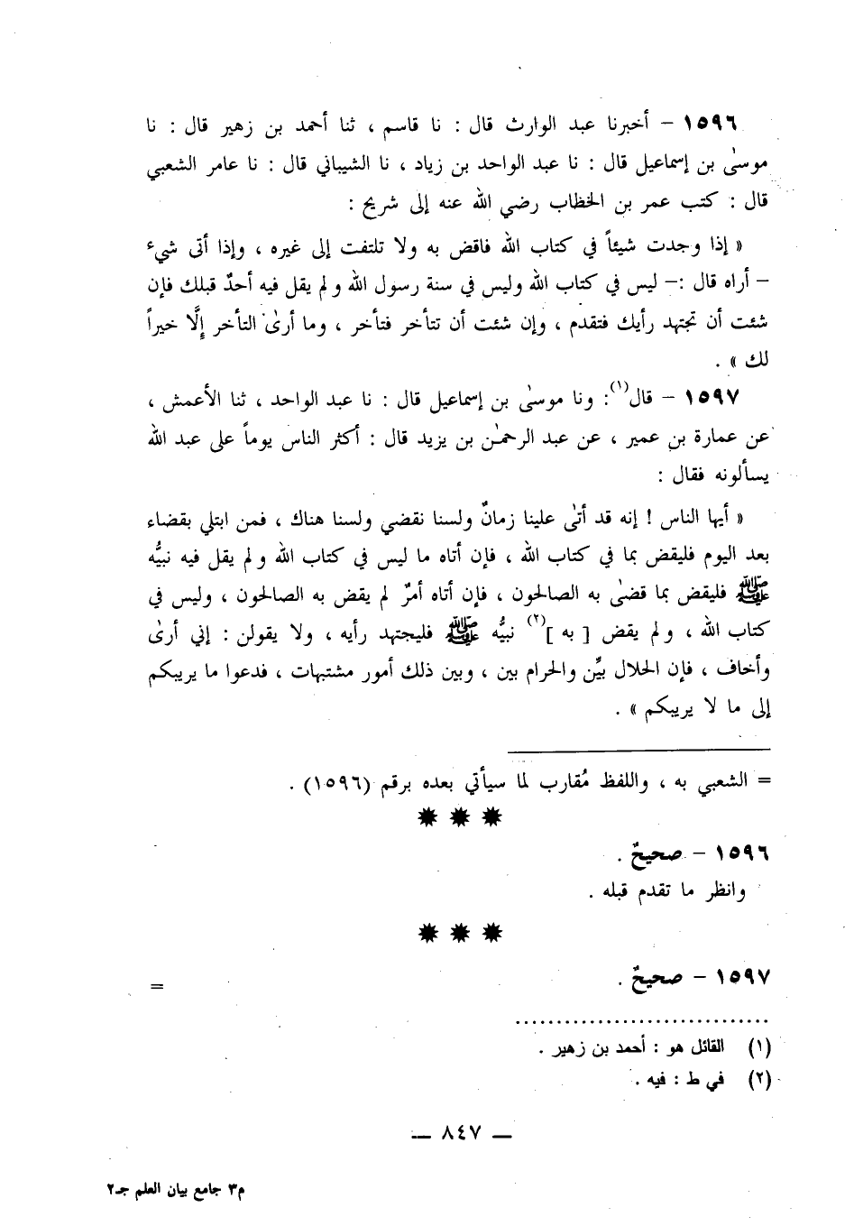 1597 - قَالَ: وَنا مُوسَى بْنُ إِسْمَاعِيلَ قَالَ: نا عَبْدُ الْوَاحِدِ، ثنا الْأَعْمَشُ، عَنْ عُمَارَةَ بْنِ عُمَيْرٍ، عَنْ عَبْدِ الرَّحْمَنِ بْنِ يَزِيدَ قَالَ: أَكْثَرَ النَّاسُ يَوْمًا عَلَى عَبْدِ اللَّهِ يَسْأَلُونَهُ فَقَالَ: " أَيُّهَا النَّاسُ إِنَّهُ قَدْ أَتَى عَلَيْنَا زَمَانٌ وَلَسْنَا نَقْضِي وَلَسْنَا هُنَاكَ §فَمَنِ ابْتُلِيَ بِقَضَاءٍ بَعْدَ الْيَوْمِ فَلْيَقْضِ بِمَا فِي كِتَابِ اللَّهِ، فَإِنْ أَتَاهُ مَا لَيْسَ فِي كِتَابِ اللَّهِ وَلَمْ يَقُلْ فِيهِ نَبِيُّهُ صَلَّى اللَّهُ عَلَيْهِ وَسَلَّمَ فَلْيَقْضِ بِمَا قَضَى بِهِ الصَّالِحُونَ، فَإِنْ أَتَاهُ أَمْرٌ لَمْ يَقْضِ بِهِ الصَّالِحُونَ وَلَيْسَ فِي كِتَابِ اللَّهِ وَلَمْ يَقْضِ بِهِ نَبِيُّهُ صَلَّى اللَّهُ عَلَيْهِ وَسَلَّمَ، فَلْيَجْتَهِدْ رَأْيَهُ، وَلَا يَقُولَنَّ: إِنِّي أَرَى وَأَخَافُ فَإِنَّ الْحَلَالَ بَيِّنٌ وَالْحَرَامَ بَيِّنٌ وَبَيْنَ ذَلِكَ أُمُورٌ مُشْتَبِهَاتٌ فَدَعُوا مَا يَرِيبُكُمْ إِلَى مَا لَا يَرِيبُكُمْ " -[848]- قَالَ أَبُو عُمَرَ: «هَذَا يُوَضِّحُ لَكَ أَنَّ الِاجْتِهَادَ لَا يَكُونُ إِلَّا عَلَى أُصُولٍ يُضَافُ إِلَيْهَا التَّحْلِيلُ وَالتَّحْرِيمُ، وَأَنَّهُ لَا يَجْتَهِدُ إِلَّا عَالِمٌ بِهَا وَمَنْ أُشْكِلَ عَلَيْهِ شَيْءٌ لَزِمَهُ الْوُقُوفُ، وَلَمْ يَجُزْ لَهُ أَنْ يُحِيلَ عَلَى اللَّهِ قَوْلًا فِي دِينِهِ لَا نَظِيرَ لَهُ مِنْ أَصْلٍ وَلَا هُوَ فِي مَعْنَى أَصْلٍ وَهَذَا الَّذِي لَا خِلَافَ فِيهِ بَيْنَ أَئِمَّةِ الْأَمْصَارِ قَدِيمًا وَحَدِيثًا فَتَدَبَّرْهُ»