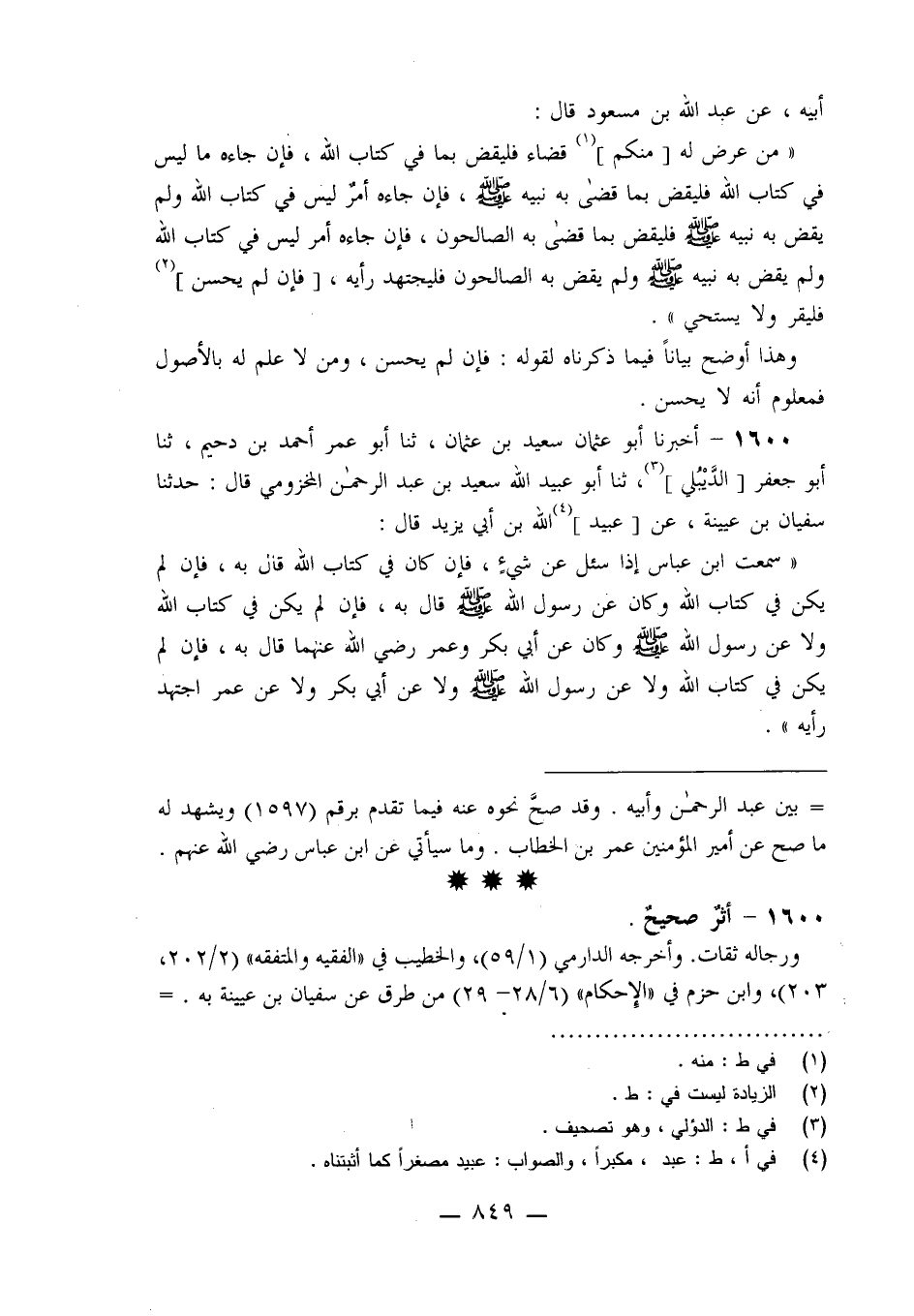 1600 - أَخْبَرَنَا أَبُو عُثْمَانَ سَعِيدُ بْنُ عُثْمَانَ، ثنا أَبُو عُمَرَ أَحْمَدُ بْنُ دُحَيْمٍ، ثنا أَبُو جَعْفَرٍ الدَّيْبُلِيُّ، ثنا أَبُو عُبَيْدِ اللَّهِ سَعِيدُ بْنُ عَبْدِ الرَّحْمَنِ الْمَخْزُومِيُّ قَالَ: حَدَّثَنَا سُفْيَانُ بْنُ عُيَيْنَةَ، عَنْ عُبَيْدِ اللَّهِ بْنِ أَبِي يَزِيدَ قَالَ: سَمِعْتُ ابْنَ عَبَّاسٍ، §«إِذَا سُئِلَ عَنْ شَيْءٍ فَإِنْ كَانَ فِي كِتَابِ اللَّهِ قَالَ بِهِ فَإِنْ لَمْ يَكُنْ فِي كِتَابِ اللَّهِ وَكَانَ عَنْ رَسُولِ اللَّهِ صَلَّى اللَّهُ عَلَيْهِ وَسَلَّمَ قَالَ بِهِ، فَإِنْ لَمْ يَكُنْ فِي كِتَابِ اللَّهِ وَلَا عَنْ رَسُولِ اللَّهِ صَلَّى اللَّهُ عَلَيْهِ وَسَلَّمَ وَكَانَ عَنْ أَبِي بَكْرٍ وَعُمَرَ رَضِيَ اللَّهُ عَنْهُمَا قَالَ بِهِ، فَإِنْ لَمْ يَكُنْ فِي كِتَابِ اللَّهِ وَلَا عَنْ رَسُولِ اللَّهِ صَلَّى اللَّهُ عَلَيْهِ وَسَلَّمَ وَلَا عَنْ أَبِي بَكْرٍ، وَلَا عَنْ عُمَرَ اجْتَهَدَ رَأْيَهُ»