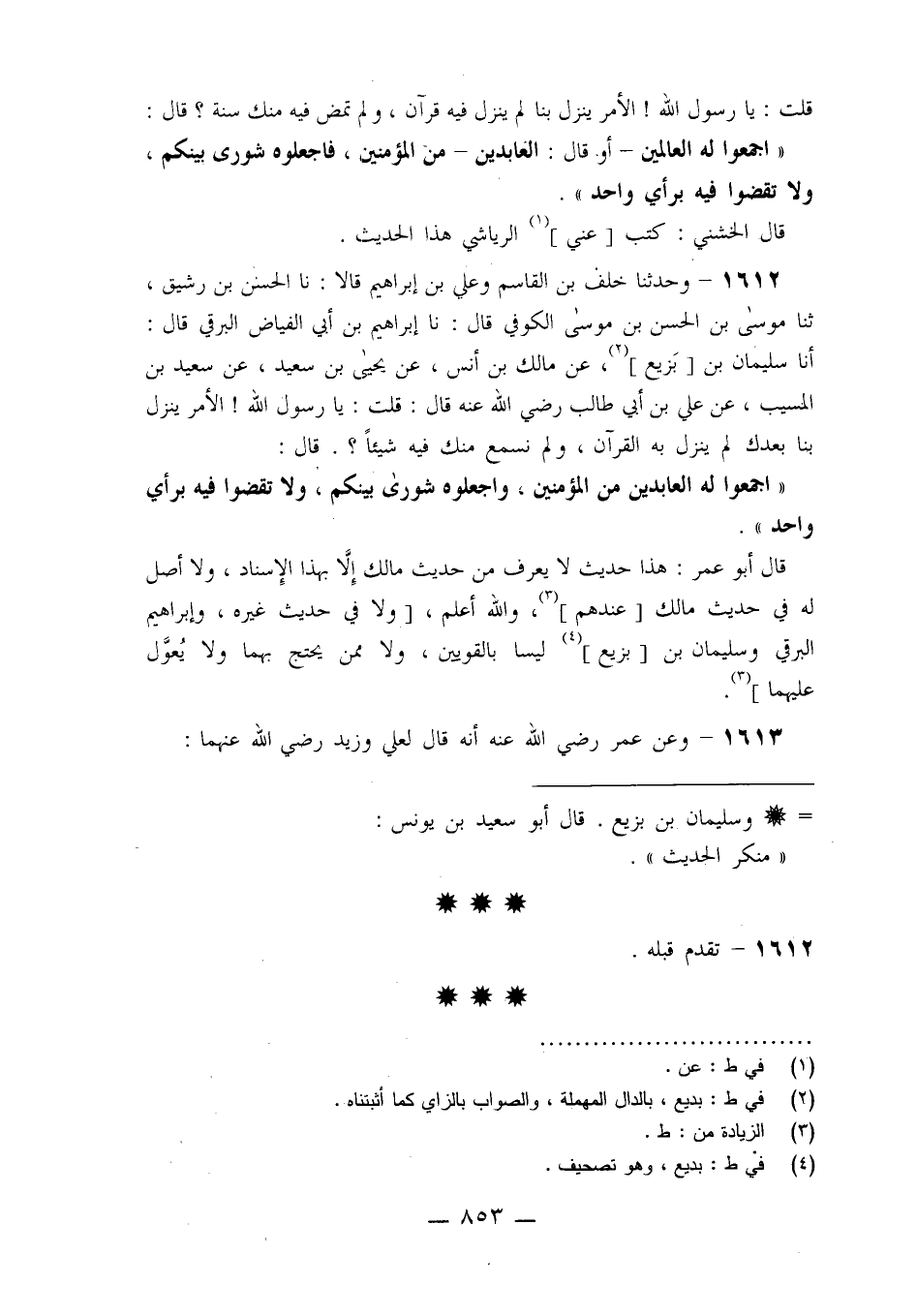 1612 - وَحَدَّثَنَا خَلَفُ بْنُ الْقَاسِمِ، وَعَلِيُّ بْنُ إِبْرَاهِيمَ قَالَا: نا الْحَسَنُ بْنُ رَشِيقٍ، ثنا مُوسَى بْنُ الْحَسَنِ بْنِ مُوسَى الْكُوفِيُّ قَالَ: نا إِبْرَاهِيمُ بْنُ أَبِي الْفَيَّاضِ الْبَرْقِيُّ قَالَ: أنا سُلَيْمَانُ بْنُ بَزِيعٍ، عَنْ مَالِكِ بْنِ أَنَسٍ، عَنْ يَحْيَى بْنِ سَعِيدٍ، عَنْ سَعِيدِ بْنِ الْمُسَيِّبِ، عَنْ عَلِيِّ بْنِ أَبِي طَالِبٍ رَضِيَ اللَّهُ عَنْهُ قَالَ: قُلْتُ: يَا رَسُولَ اللَّهِ، §الْأَمْرُ يَنْزِلُ بِنَا بَعْدَكَ لَمْ يَنْزِلْ بِهِ الْقُرْآنُ وَلَمْ نَسْمَعْ مِنْكَ فِيهِ شَيْئًا، قَالَ: «اجْمَعُوا لَهُ الْعَابِدِينَ مِنَ الْمُؤْمِنِينَ وَاجْعَلُوهُ شُورَى بَيْنَكُمْ وَلَا تَقْضُوا فِيهِ بِرَأْيٍ وَاحِدٍ» قَالَ أَبُو عُمَرَ: «هَذَا حَدِيثٌ لَا يُعْرَفُ مِنْ حَدِيثِ مَالِكٍ إِلَّا بِهَذَا الْإِسْنَادِ، وَلَا أَصْلَ لَهُ فِي حَدِيثِ مَالِكٍ عِنْدَهُمْ وَاللَّهُ أَعْلَمُ وَلَا فِي حَدِيثِ غَيْرِهِ، وَإِبْرَاهِيمُ الْبَرْقِيُّ، وَسُلَيْمَانُ بْنُ بَزِيعٍ لَيْسَا بِالْقَوِيَّيْنِ وَلَا مِمَّنْ يُحْتَجُّ بِهِمَا وَلَا يُعَوَّلُ عَلَيْهِمَا»