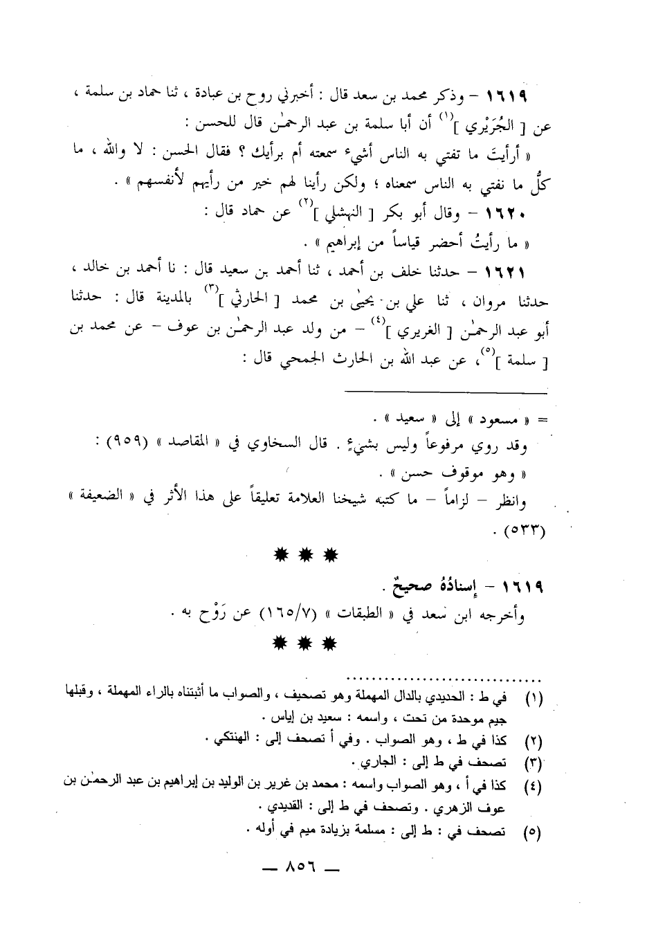 1624 - وَذَكَرَ أَبُو الْقَاسِمِ عُبَيْدُ اللَّهِ بْنُ عُمَرَ فِي كِتَابِ الْقِيَاسِ مِنْ كُتُبِهِ فِي الْأُصُولِ، فَقَالَ: مَا عَلِمْتُ أَنَّ أَحَدًا مِنَ الْبَصْرِيِّينَ وَلَا غَيْرِهِمْ مِمَّنْ لَهُ نَبَاهَةٌ سَبَقَ إِبْرَاهِيمَ النَّظَّامَ إِلَى الْقَوْلِ بِنَفْيِ الْقِيَاسِ وَالِاجْتِهَادِ وَلَمْ يَلْتَفِتْ إِلَيْهِ الْجُمْهُورُ وَقَدْ خَالَفَهُ فِي ذَلِكَ أَبُو الْهُذَيْلِ وَقَمَعَهُ فِيهِ وَرَدَّهُ عَلَيْهِ هُوَ وَأَصْحَابُهُ، قَالَ: وَكَانَ بِشْرُ بْنُ الْمُعْتَمِرِ شَيْخُ الْبَغْدَادِيِّينَ وَرَئِيسُهُمْ مِنْ أَشَدِّ النَّاسِ نُصْرَةً لِلْقِيَاسِ وَاجْتِهَادِ الرَّأْيِ فِي الْأَحْكَامِ هُوَ وَأَصْحَابُهُ وَكَانَ هُوَ وَأَبُو الْهُذَيْلِ كَأَ نَّهُمَا يَنْطِقَانِ فِي ذَلِكَ بِلِسَانٍ وَاحِدٍ " قَالَ أَبُو عُمَرَ: «بِشْرُ بْنُ الْمُعْتَمِرِ وَأَبُو الْهُذَيْلِ مِنْ رُؤَسَاءِ الْمُعْتَزِلَةِ وَأَهْلِ الْكَلَامِ وَأَمَّا بِشْرُ بْنُ غِيَاثٍ الْمَرِّيسِيُّ فَمِنْ أَصْحَابِ أَبِي حَنِيفَةَ الْمُغْرِقِينَ فِي الْقِيَاسِ النَّاصِرِينَ لَهُ الدَّائِنِينَ بِهِ، وَلَكِنَّهُ مُبْتَدِعٌ أَيْضًا قَائِلٌ بِالْمَخْلُوقِ، وَسَائِرُ أَهْلِ السُّنَّةِ وَأَهْلِ الْعِلْمِ عَلَى مَا ذَكَرْتُ لَكَ إِلَّا أَنَّ مِنْهُمَ مَنْ لَا يَرَى الْقَوْلَ بِذَلِكَ إِلَّا عِنْدَ نُزُولِ النَّازِلَةِ، وَمِنْهُمْ مَنْ أَجَازَ الْجَوَابَ فِيهَا لِمَنْ يَأْتِي بَعْدُ، وَهُمْ أَكْثَرُ أَئِمَّةِ الْفَتْوَى، وَبِاللَّهِ التَّوْفِيقُ»