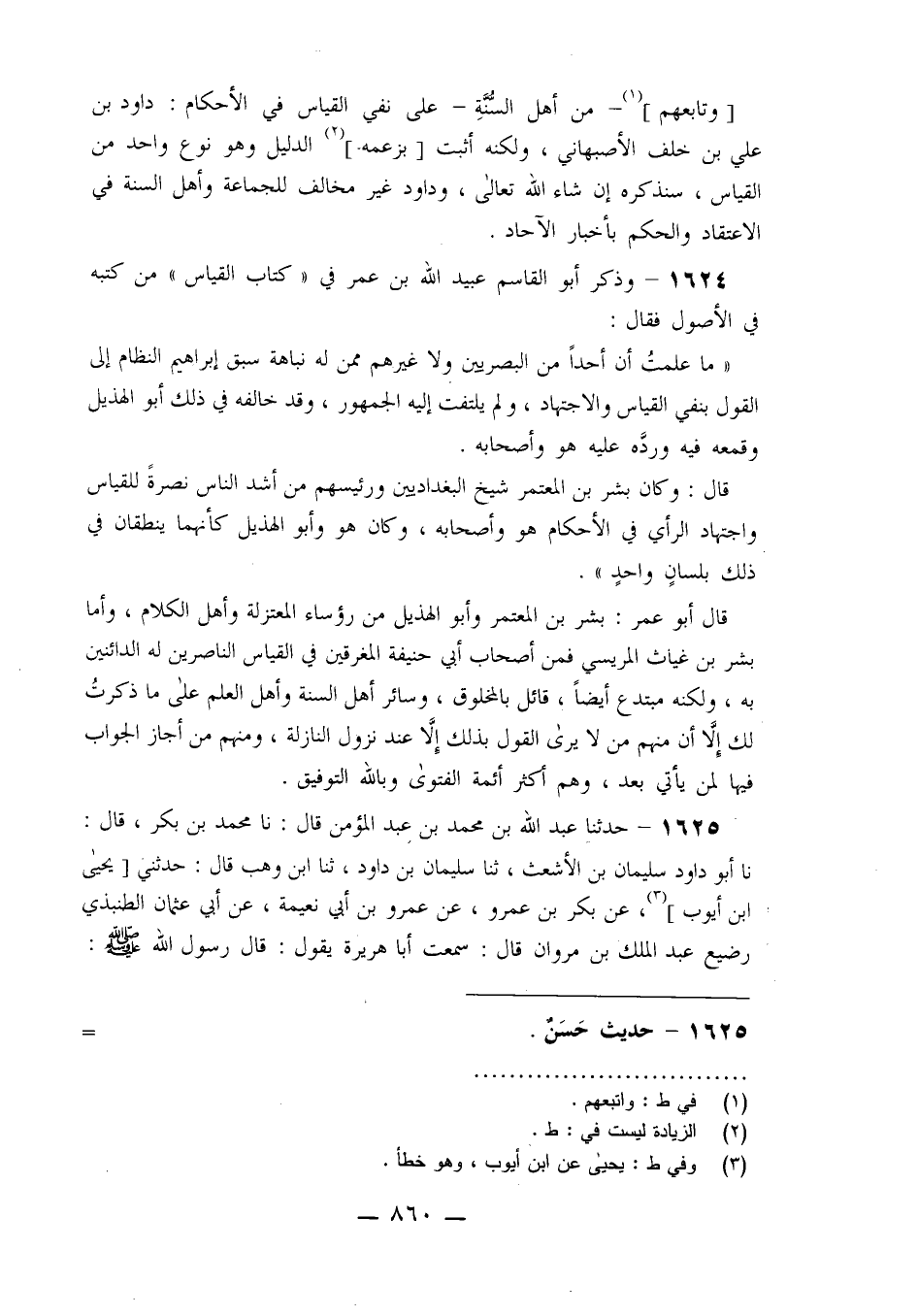 1625 - حَدَّثَنَا عَبْدُ اللَّهِ بْنُ مُحَمَّدِ بْنِ عَبْدِ الْمُؤْمِنِ قَالَ: نا مُحَمَّدُ بْنُ بَكْرٍ قَالَ: نا أَبُو دَاوُدَ سُلَيْمَانُ بْنُ الْأَشْعَثِ، ثنا سُلَيْمَانُ بْنُ دَاوُدَ ثنا ابْنُ وَهْبٍ قَالَ: حَدَّثَنِي يَحْيَى بْنُ أَيُّوبَ، عَنْ بَكْرِ بْنِ عَمْرٍو، عَنْ عَمْرِو بْنِ أَبِي نُعَيْمَةَ، عَنْ أَبِي عُثْمَانَ الطُّنْبُذِيِّ، رَضِيعِ عَبْدِ الْمَلِكِ بْنِ مَرْوَانَ قَالَ: سَمِعْتُ أَبَا هُرَيْرَةَ يَقُولُ: قَالَ رَسُولُ اللَّهِ صَلَّى اللَّهُ عَلَيْهِ وَسَلَّمَ: -[861]- «§مَنْ أُفْتِيَ بِغَيْرِ عِلْمٍ كَانَ إِثْمُهُ عَلَى مَنْ أَفْتَاهُ، وَمَنْ أَشَارَ عَلَى أَخِيهِ بِأَمْرٍ يَعْلَمُ الرُّشْدَ فِي غَيْرِهِ فَقَدْ خَانَهُ» ، قَالَ أَبُو عُمَرَ: «اسْمُ أَبِي عُثْمَانَ الطُّنْبُذِيِّ مُسْلِمُ بْنُ يَسَارٍ»