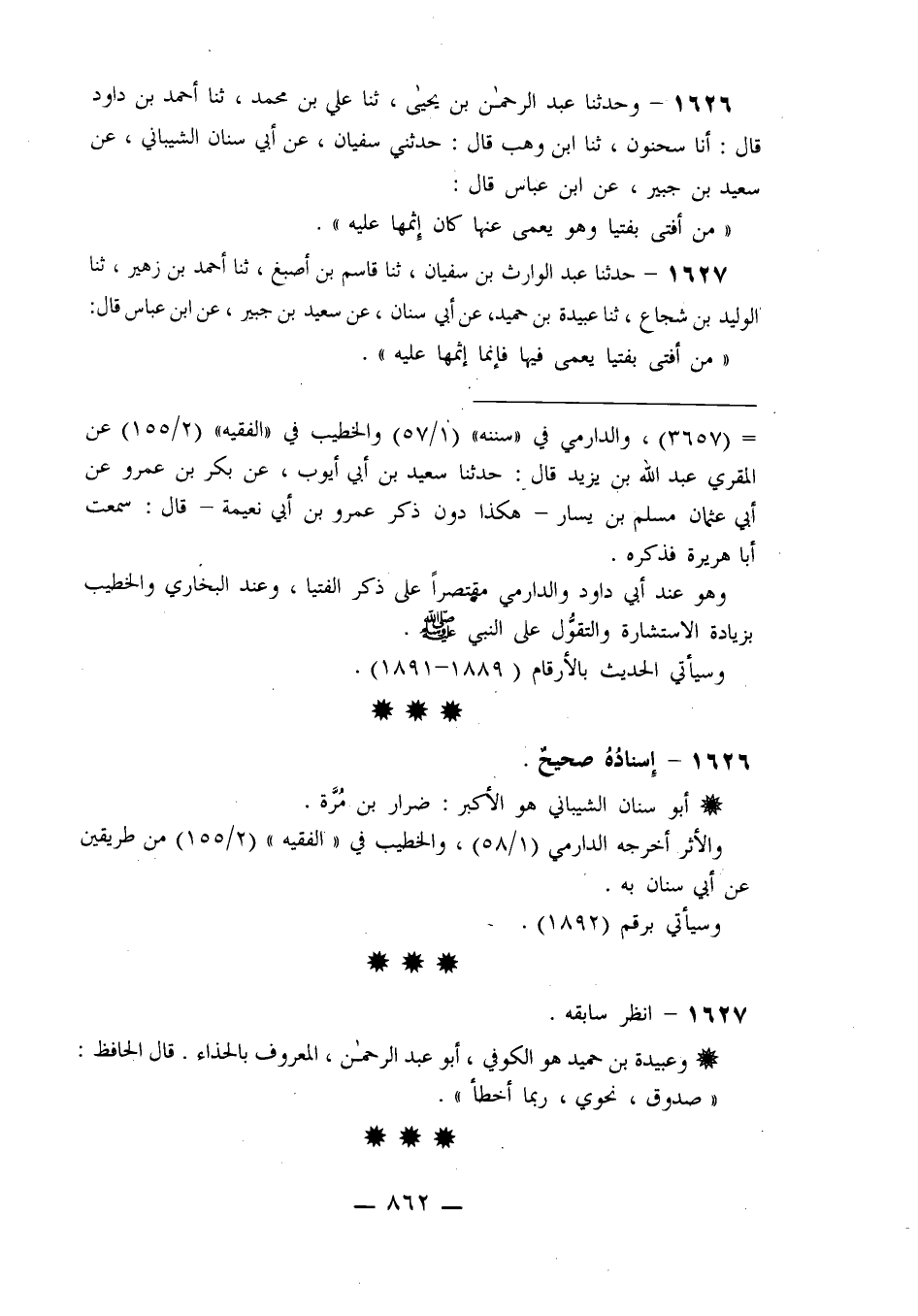 1627 - حَدَّثَنَا عَبْدُ الْوَارِثِ بْنُ سُفْيَانَ، ثنا قَاسِمُ بْنُ أَصْبَغَ: ثنا أَحْمَدُ بْنُ زُهَيْرٍ ثنا الْوَلِيدُ بْنُ شُجَاعٍ، ثنا عَبِيدَةُ بْنُ حُمَيْدٍ، عَنْ أَبِي سِنَانٍ، عَنْ سَعِيدِ بْنِ جُبَيْرٍ، عَنِ ابْنِ عَبَّاسٍ قَالَ: §«مَنْ أَفْتَى بِفُتْيَا يَعْمَى فِيهَا فَإِنَّمَا إِثْمُهَا عَلَيْهِ»