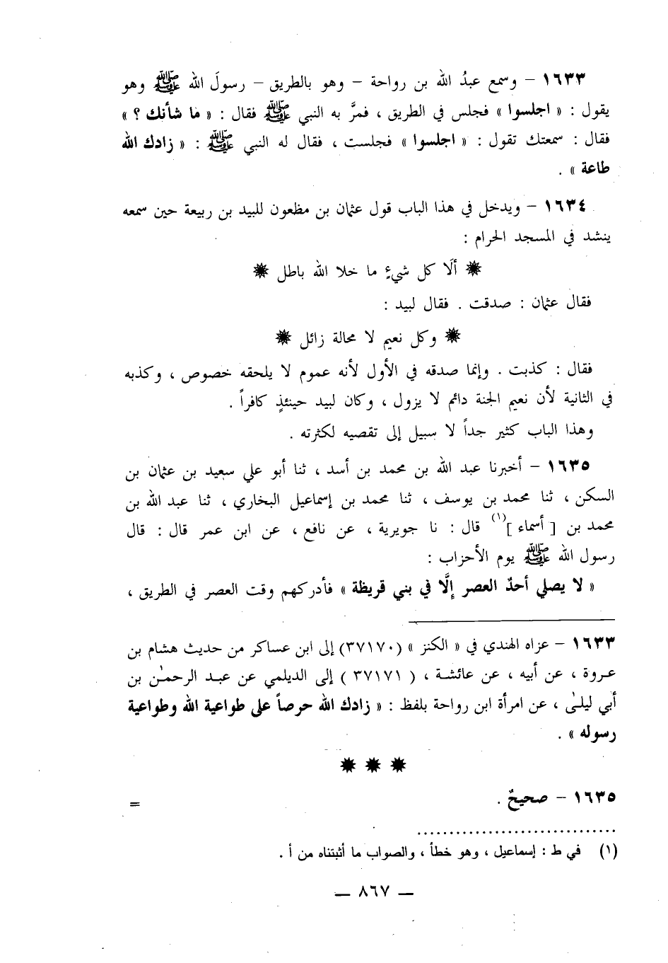 1635 - أَخْبَرَنَا عَبْدُ اللَّهِ بْنُ مُحَمَّدِ بْنِ أَسَدٍ، ثنا أَبُو عَلِيٍّ سَعِيدُ بْنُ عُثْمَانَ بْنِ السَّكَنِ، ثنا مُحَمَّدُ بْنُ يُوسُفَ، ثنا مُحَمَّدُ بْنُ إِسْمَاعِيلَ الْبُخَارِيُّ، ثنا عَبْدُ اللَّهِ بْنُ مُحَمَّدِ بْنِ أَسْمَاءَ قَالَ: نا جُوَيْرِيَةُ، عَنْ نَافِعٍ، عَنِ ابْنِ عُمَرَ، قَالَ قَالَ رَسُولُ اللَّهِ صَلَّى اللَّهُ عَلَيْهِ وَسَلَّمَ يَوْمَ الْأَحْزَابِ: «§لَا يُصَلِّي أَحَدٌ الْعَصْرَ إِلَّا فِي بَنِي قُرَيْظَةَ» فَأَدْرَكَهُمْ وَقْتُ الْعَصْرِ فِي الطَّرِيقِ -[868]- فَقَالَ بَعْضُهُمْ: لَا نُصَلِّي حَتَّى نَأْتِيَهَا وَقَالَ آخَرُونَ: بَلْ نُصَلِّي وَلَمْ يُرَدْ مِنَّا ذَلِكَ فَذُكِرَ ذَلِكَ لِلنَّبِيِّ صَلَّى اللَّهُ عَلَيْهِ وَسَلَّمَ فَلَمْ يُعَنِّفْ وَاحِدَةً مِنَ الطَّائِفَتَيْنِ قَالَ أَبُو عُمَرَ: «هَذِهِ سَبِيلُ الِاجْتِهَادِ عَلَى الْأُصُولِ عِنْدَ جَمَاعَةِ الْفُقَهَاءِ؛ وَلِذَلِكَ لَا يَرُدُّونَ مَا اجْتَهَدَ فِيهِ الْقَاضِي وَقَضَى بِهِ إِذَا لَمْ يُرَدَّ إِلَّا إِلَى اجْتِهَادٍ مِثْلِهِ وَأَمَّا مَنْ أَخْطَأَ مَنْصُوصًا مِنْ كِتَابِ اللَّهِ تَعَالَى أَوْ سُنَّةِ رَسُولِهِ صَلَّى اللَّهُ عَلَيْهِ وَسَلَّمَ بِنَقْلِ الْكَافَّةِ أَوْ نَقْلِ الْعُدُولِ فَقَوْلُهُ وَفِعْلُهُ عِنْدَهُمْ مَرْدُودٌ إِذَا ثَبَتَ الْأَصْلُ فَافْهَمْ، وَبِاللَّهِ التَّوْفِيقُ»