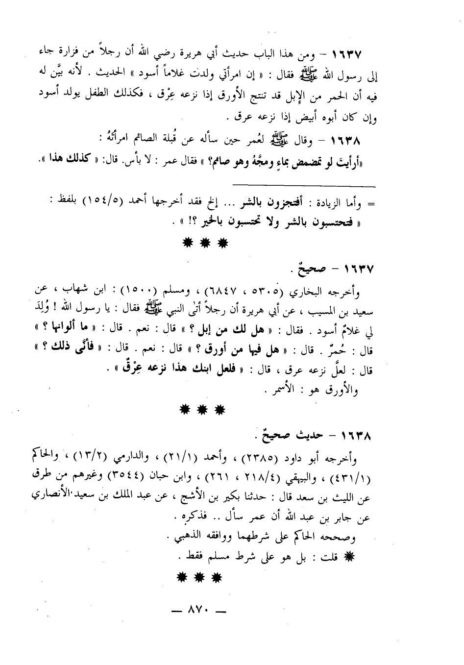 1637 - وَمِنْ هَذَا الْبَابِ حَدِيثُ أَبِي هُرَيْرَةَ رَضِيَ اللَّهُ عَنْهُ أَنَّ رَجُلًا مِنْ فَزَارَةَ جَاءَ إِلَى رَسُولِ اللَّهِ صَلَّى اللَّهُ عَلَيْهِ وَسَلَّمَ، فَقَالَ: إِنَّ امْرَأَتِي وَلَدَتْ غُلَامًا أَسْوَدَ، الْحَدِيثَ؛ لِأَنَّهُ بَيَّنَ لَهُ فِيهِ أَنَّ الْحُمْرَ مِنَ الْإِبِلِ قَدْ تُنْتِجُ الْأَوْرَقَ إِذَا نَزَعَهُ عِرْقٌ فَكَذَلِكَ الطِّفْلُ يُولَدُ أَسْوَدَ وَإِنْ كَانَ أَبُوهُ أَبْيَضَ إِذَا نَزَعَهُ عِرْقٌ.