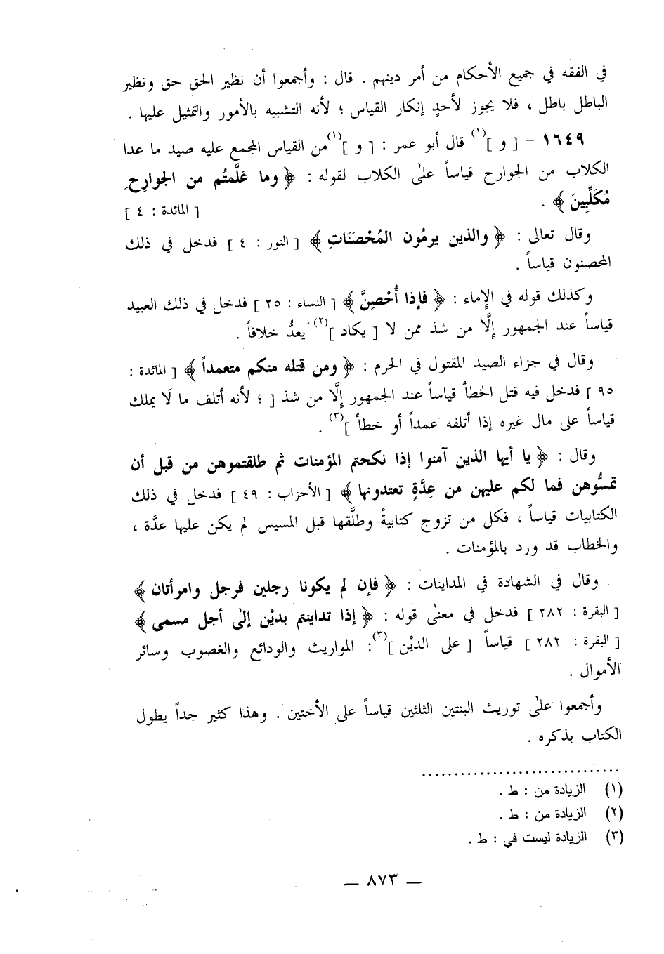 1649 - وَقَالَ أَبُو عُمَرَ: " وَمِنَ الْقِيَاسِ الْمُجْمَعِ عَلَيْهِ صَيْدُ مَا عَدَا الْكِلَابِ مِنَ الْجَوَارِحِ قِيَاسًا عَلَى الْكِلَابِ لِقَوْلِهِ {وَمَا عَلَّمْتُمْ مِنَ الْجَوَارِحِ مُكَلِّبِينَ} [سورة: المائدة، آية رقم: 4] وَقَالَ تَعَالَى: {وَالَّذِينَ يَرْمُونَ الْمُحْصَنَاتِ} [سورة: النور، آية رقم: 4] فَدَخَلَ فِي ذَلِكَ الْمُحْصَنُونُ قِيَاسًا، وَكَذَلِكَ قَوْلُهُ فِي الْإِمَاءِ {فَإِذَا أُحْصِنَّ} [سورة: النساء، آية رقم: 25] فَدَخَلَ فِي ذَلِكَ الْعَبِيدُ قِيَاسًا عِنْدَ الْجُمْهُورِ إِلَّا مَنْ شَذَّ مِمَّنْ لَا يَكَادُ يُعَدُّ خِلَافًا، وَقَالَ فِي جَزَاءِ الصَّيْدِ الْمَقْتُولِ فِي الْحَرَمِ {وَمَنْ قَتَلَهُ مِنْكُمْ مُتَعَمِّدًا} [سورة: المائدة، آية رقم: 95] فَدَخَلَ فِيهِ قَتْلُ الْخَطَأِ قِيَاسًا عِنْدَ الْجُمْهُورِ إِلَّا مَنْ شَذَّ لِأَنَّهُ أَتْلَفَ مَا لَا يَمْلِكُ قِيَاسًا عَلَى مَا لِغَيْرِهِ إِذَا أَتْلَفَهُ عَمْدًا أَوْ خَطَأً، وَقَالَ: {يَا أَيُّهَا الَّذِينَ آمَنُوا إِذَا نَكَحْتُمُ الْمُؤْمِنَاتِ ثُمَّ طَلَّقْتُمُوهُنَّ مِنْ قَبْلِ أَنْ تَمَسُّوهُنَّ فَمَا لَكُمْ عَلَيْهِنَّ مِنْ عِدَّةٍ تَعْتَدُّونَهَا} [سورة: الأحزاب، آية رقم: 49] فَدَخَلَ فِي ذَلِكَ الْكِتَابِيَّاتُ قِيَاسًا فَكُلُّ مَنْ تَزَوَّجَ كِتَابِيَّةً وَطَلَّقَهَا قَبْلَ الْمَسِيسِ لَمْ يَكُنْ عَلَيْهَا عِدَّةٌ، وَالْخِطَابُ قَدْ وَرَدَ بِالْمُؤْمِنَاتِ، وَقَالَ فِي الشَّهَادَةِ فِي الْمُدَايَنَاتِ {فَإِنْ لَمْ يَكُونَا رَجُلَيْنِ فَرَجُلٌ وَامْرَأَتَانِ} [سورة: البقرة، آية رقم: 282] فَدَخَلَ فِي مَعْنَى قَوْلِهِ {إِذَا تَدَايَنْتُمْ بِدَيْنٍ إِلَى أَجَلٍ مُسَمًّى} [سورة: البقرة، آية رقم: 282] قِيَاسًا عَلَى الدَّيْنِ الْمَوَارِيثُ وَالْوَدَائِعُ وَالْغُصُوبُ وَسَائِرُ الْأَمْوَالِ، وَأَجْمَعُوا عَلَى تَوْرِيثِ الْبِنْتَيْنِ الثُّلُثَيْنِ قِيَاسًا عَلَى الْأُخْتَيْنِ وَهَذَا كَثِيرٌ جِدًّا يَطُولُ الْكِتَابُ بِذِكْرِهِ،