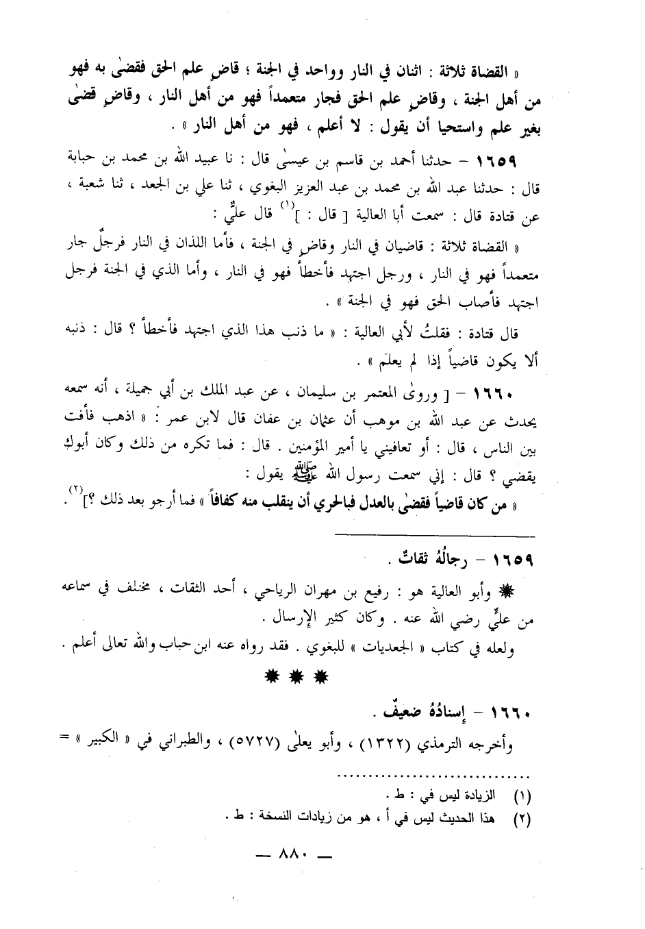 1659 - حَدَّثَنَا أَحْمَدُ بْنُ قَاسِمِ بْنِ عِيسَى قَالَ: نا عُبَيْدُ اللَّهِ بْنُ مُحَمَّدِ بْنِ حُبَابَةَ قَالَ: حَدَّثَنَا عَبْدُ اللَّهِ بْنُ مُحَمَّدِ بْنِ عَبْدِ الْعَزِيزِ الْبَغَوِيُّ، ثنا عَلِيُّ بْنُ الْجَعْدِ، ثنا شُعْبَةُ، عَنْ قَتَادَةَ قَالَ: سَمِعْتُ أَبَا الْعَالِيَةِ قَالَ: قَالَ عَلِيٌّ، «§الْقُضَاةُ ثَلَاثَةٌ، قَاضِيَانِ فِي النَّارِ وَقَاضٍ فِي الْجَنَّةِ فَأَمَّا اللَّذَانِ فِي النَّارِ، فَرَجُلٌ جَارَ مُتَعَمِّدًا فَهُوَ فِي النَّارِ، وَرَجُلٌ اجْتَهَدَ فَأَخْطَأَ فَهُوَ فِي النَّارِ، وَأَمَّا الَّذِي فِي الْجَنَّةِ فَرَجُلٌ اجْتَهَدَ فَأَصَابَ الْحَقَّ فَهُوَ إِلَى الْجَنَّةِ» قَالَ قَتَادَةُ: فَقُلْتُ لِأَبِي الْعَالِيَةِ: مَا ذَنْبُ هَذَا الَّذِي اجْتَهَدَ فَأَخْطَأَ؟ قَالَ: ذَنْبُهُ أَلَّا يَكُونَ قَاضِيًا إِذَا لَمْ يَعْلَمْ
