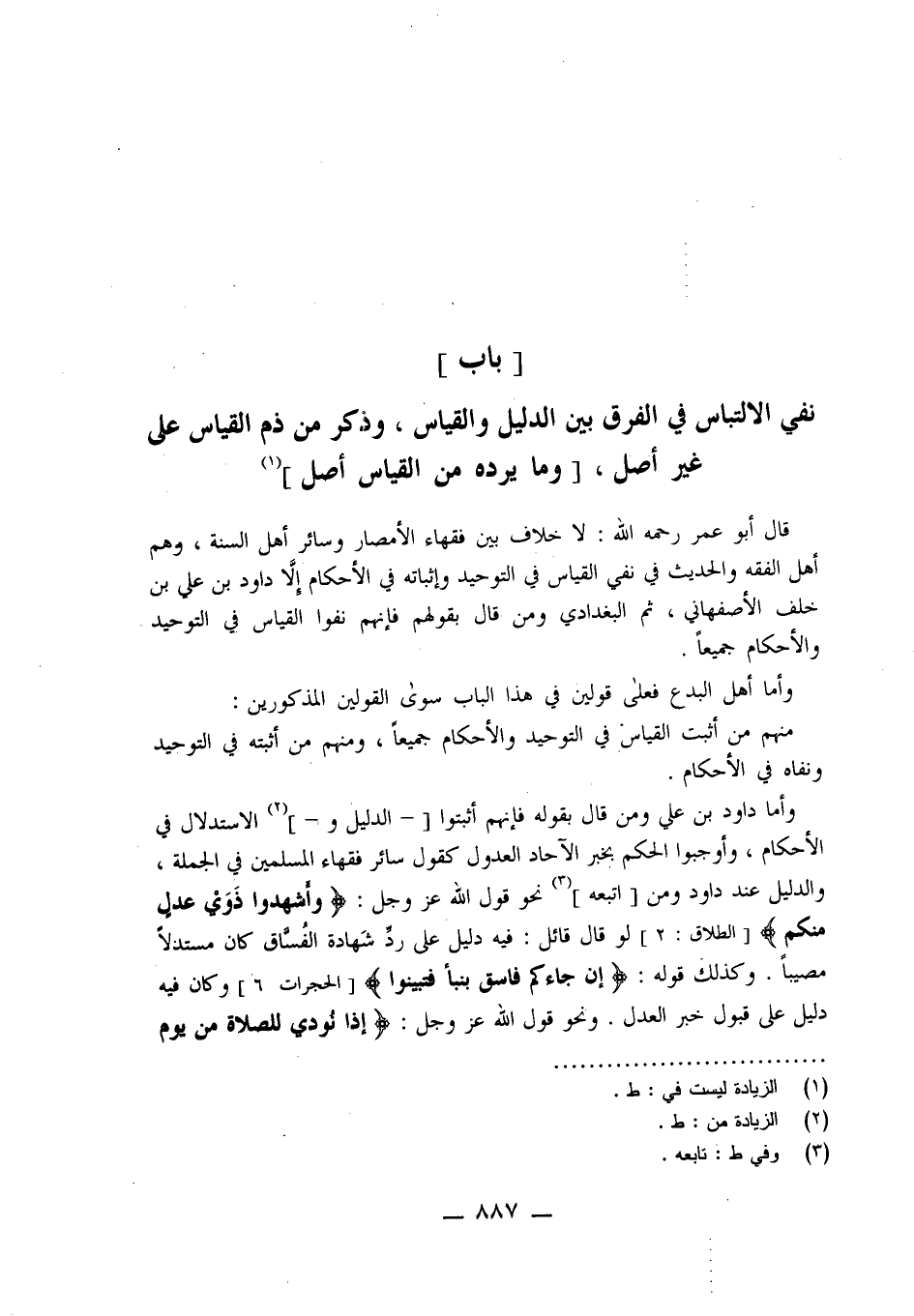 §بَابُ نَفْيِ الِالْتِبَاسِ فِي الْفَرْقِ بَيْنَ الدَّلِيلِ " وَالْقِيَاسِ وَذِكْرِ مَنْ ذَمَّ الْقِيَاسَ عَلَى غَيْرِ أَصْلٍ وَمَا يَرُدُّهُ مِنَ الْقِيَاسِ أَصْلٌ قَالَ أَبُو عُمَرَ رَحِمَهُ اللَّهُ: " لَا خِلَافَ بَيْنَ فُقَهَاءِ الْأَمْصَارِ وَسَائِرِ أَهْلِ السُّنَّةِ، وَهُمْ أَهْلُ الْفِقْهِ وَالْحَدِيثِ فِي نَفْيِ الْقِيَاسِ فِي التَّوْحِيدِ وَإِثْبَاتِهِ فِي الْأَحْكَامِ إِلَّا دَاوُدَ بْنَ عَلِيِّ بْنِ خَلَفٍ الْأَصْفَهَانِيَّ ثُمَّ الْبَغْدَادِيَّ وَمَنْ قَالَ بِقَوْلِهِمْ، فَإِنَّهُمْ نَفَوَا الْقِيَاسَ فِي التَّوْحِيدِ وَالْأَحْكَامِ جَمِيعًا، وَأَمَّا أَهْلُ الْبِدَعِ فَعَلَى قَوْلَيْنِ فِي هَذَا الْبَابِ سِوَى الْقَوْلَيْنِ الْمَذْكُورَيْنِ، مِنْهُمْ مَنْ أَثْبَتَ الْقِيَاسَ فِي التَّوْحِيدِ وَالْأَحْكَامِ جَمِيعًا، وَمِنْهُمْ مَنْ أَثْبَتَهُ فِي التَّوْحِيدِ وَنَفَاهُ فِي الْأَحْكَامِ وَأَمَّا دَاوُدُ بْنُ عَلِيٍّ وَمَنْ قَالَ بِقَوْلِهِ، فَإِنَّهُمْ أَثْبَتُوا الدَّلِيلَ وَالِاسْتِدْلَالَ فِي الْأَحْكَامِ وَأَوْجَبُوا الْحُكْمَ بِخَبَرِ الْآحَادِ الْعُدُولِ كَقَوْلِ سَائِرِ فُقَهَاءِ الْمُسْلِمِينَ فِي الْجُمْلَةِ، وَالدَّلِيلُ عِنْدَ دَاوُدَ وَمَنْ اتّبَعَهُ نَحْوُ قَوْلِ اللَّهِ جَلَّ وَعَزَّ {وَأَشْهِدُوا ذَوَيْ عَدْلٍ مِنْكُمْ} [الطلاق: 2] لَوْ قَالَ قَائِلٌ: فِيهِ دَلِيلٌ عَلَى رَدِّ شَهَادَةِ الْفُسَّاقِ كَانَ مُسْتَدِلًّا مُصِيبًا وَكَذَلِكَ قَوْلُهُ {إِنْ جَاءَكُمْ فَاسِقٌ بِنَبَأٍ فَتَبَيَّنُوا} [الحجرات: 6] وَكَانَ فِيهِ دَلِيلٌ عَلَى قَبُولِ خَبَرِ الْعَدْلِ، وَنَحْوُ قَوْلِ اللَّهِ عَزَّ وَجَلَّ {إِذَا نُودِيَ لِلصَّلَاةِ مِنْ يَوْمِ