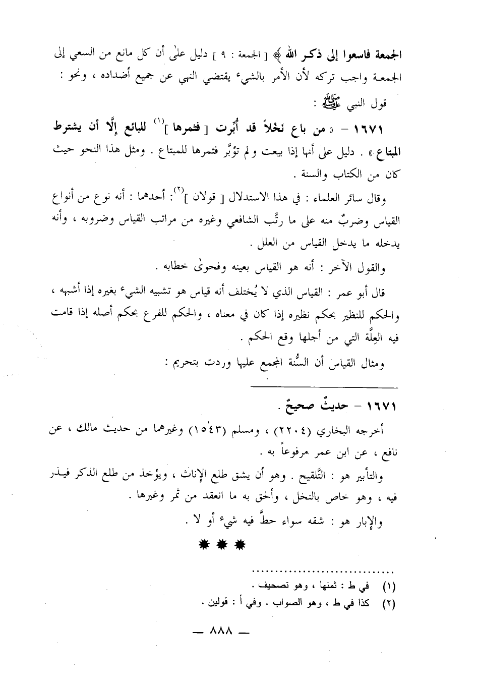 1671 - «مَنْ بَاعَ نَخْلًا قَدْ أُبِّرَتْ فَثَمَرُهَا لِلْبَائِعِ إِلَّا أَنْ يَشْتَرِطَ الْمُبْتَاعُ» دَلِيلٌ عَلَى أَنَّهَا إِذَا بِيعَتْ وَلَمْ تُؤَبَّرْ فَثَمَرُهَا لِلْمُبْتَاعِ، وَمِثْلُ هَذَا النَّحْوِ حَيْثُ كَانَ مِنَ الْكِتَابِ وَالسُّنَّةِ، وَقَالَ سَائِرُ الْعُلَمَاءِ: فِي هَذَا الِاسْتِدْلَالِ قَوْلَانِ أَحَدُهُمَا أَنَّهُ نَوْعٌ مِنْ أَنْوَاعِ الْقِيَاسِ وَضَرْبٌ مِنْهُ عَلَى مَا رَتَّبَ الشَّافِعِيُّ وَغَيْرُهُ مِنْ مَرَاتِبِ الْقِيَاسِ وَضُرُوبِهِ وَأَنَّهُ يَدْخُلُهُ مَا يَدْخُلُ الْقِيَاسَ مِنَ الْعِلَلِ، وَالْقَوْلُ الْآخَرُ أَنَّهُ هُوَ القِيَاسُ بِعَيْنِهِ وَفَحْوَى خِطَابِهِ " قَالَ أَبُو عُمَرَ: " الْقِيَاسُ الَّذِي لَا يُخْتَلَفُ أَنَّهُ قِيَاسٌ هُوَ تَشْبِيهُ الشَّيْءِ بِغَيْرِهِ إِذَا أَشْبَهَهُ وَالْحُكْمُ لِلنَّظِيرِ بِحُكْمِ نَظِيرِهِ إِذَا كَانَ فِي مَعْنَاهُ وَالْحُكْمُ لِلْفَرْعِ بِحُكْمِ أَصْلِهِ إِذَا قَامَتْ فِيهِ الْعِلَّةُ الَّتِي مِنْ أَجْلِهَا وَقَعَ الْحُكْمُ، وَمِثَالُ الْقِيَاسِ أَنَّ السُّنَّةَ الْمُجْمَعَ عَلَيْهَا وَرَدَتْ بِتَحْرِيمِ