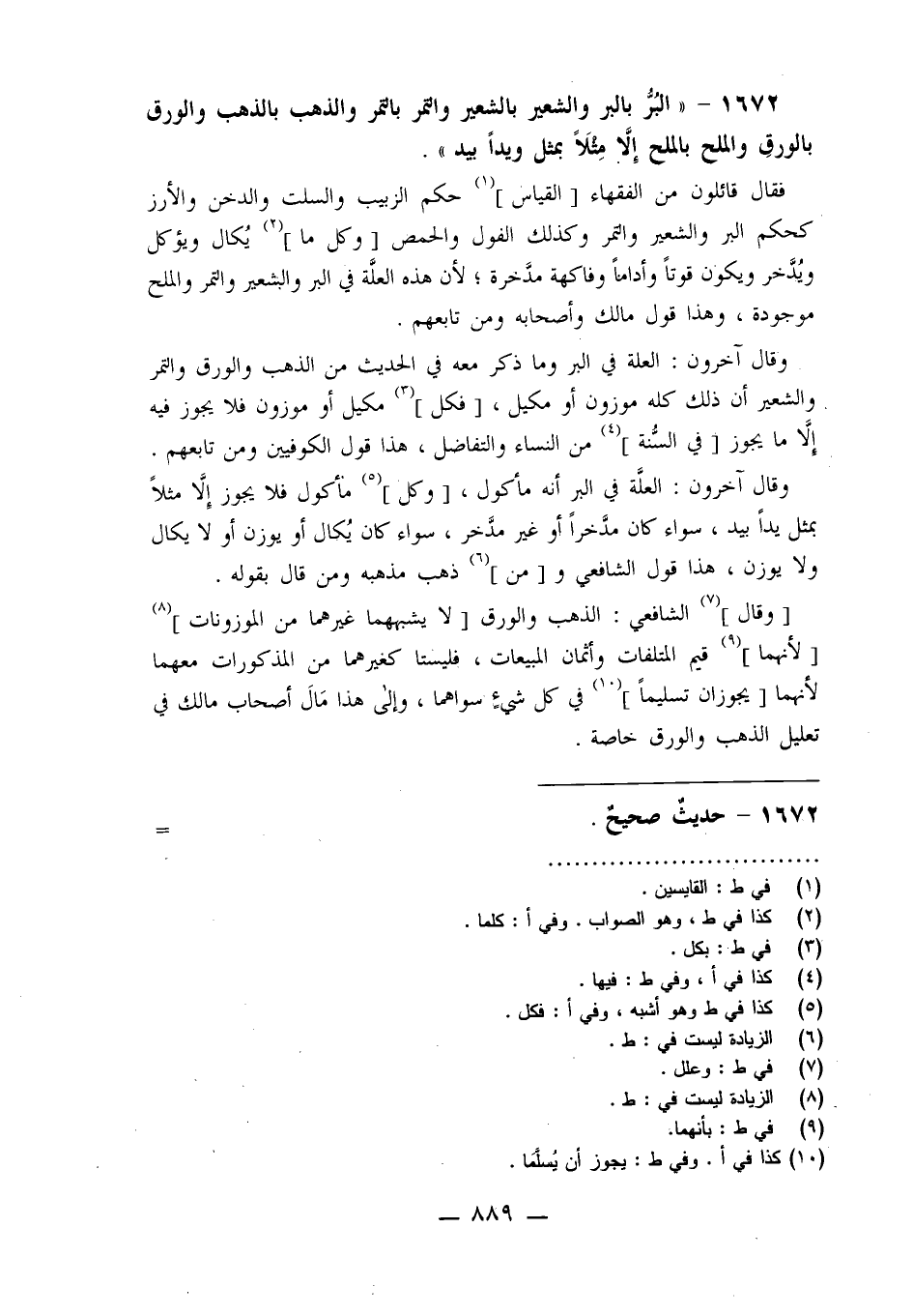 1672 - الْبُرِّ بِالْبُرِّ وَالشَّعِيرِ بِالشَّعِيرِ وَالتَّمْرِ بِالتَّمْرِ وَالذَّهَبِ بِالذَّهَبِ وَالْوَرِقِ بِالْوَرِقِ وَالْمِلْحِ بِالْمِلْحِ إِلَّا مِثْلًا بِمِثْلٍ وَيَدًا بِيَدٍ فَقَالَ قَائِلُونَ مِنَ الْفُقَهَاءِ: الْقِيَاسُ حُكْمُ الزَّبِيبِ وَالسُّلْتِ وَالدُّخْنِ وَالْأُرْزِ كَحُكْمِ الْبُرِّ وَالشَّعِيرِ وَالتَّمْرِ وَكَذَلِكَ الْفُولُ وَالْحِمَّصُ، وَكُلُّ مَا يُكَالُ وَيُؤْكَلُ وَيُدَّخَرُ وَيَكُونُ قُوتًا وَإِدَامًا وَفَاكِهَةً مُدَّخَرَةً؛ لِأَنَّ هَذِهِ الْعِلَّةَ فِي الْبُرِّ وَالشَّعِيرِ وَالتَّمْرِ وَالْمِلْحِ مَوْجُودَةٌ، وَهَذَا قَوْلُ مَالِكٍ وَأَصْحَابِهِ وَمَنْ تَابَعَهُمْ وَقَالَ آخَرُونَ: الْعِلَّةُ فِي الْبُرِّ وَمَا ذُكِرَ مَعَهُ فِي الْحَدِيثِ مِنَ الذَّهَبِ وَالْوَرِقِ وَالتَّمْرِ وَالشَّعِيرِ أَنَّ ذَلِكَ كُلَّهُ مَوْزُونٌ أَوْ مَكِيلٌ فَكُلُّ مَكِيلٍ أَوْ مَوْزُونٍ فَلَا يَجُوزُ فِيهِ إِلَّا مَا يَجُوزُ فِي السُّنَّةِ مِنَ النِّسَاءِ وَالتَّفَاضُلِ هَذَا قَوْلُ الْكُوفِيِّينَ وَمَنْ تَابَعَهُمْ وَقَالَ آخَرُونَ: الْعِلَّةُ فِي الْبُرِّ أَنَّهُ مَأْكُولٌ وَكُلُّ مَأْكُولٍ فَلَا يَجُوزُ إِلَّا مِثْلًا بِمِثْلٍ، يَدًا بِيَدٍ، سَوَاءٌ كَانَ مُدَّخَرًا أَوْ غَيْرَ مُدَّخَرٍ، سَوَاءٌ كَانَ يُكَالُ أَوْ يُوزَنُ أَوْ لَا يُكَالُ وَلَا يُوزَنُ، هَذَا قَوْلُ الشَّافِعِيِّ وَمَنْ ذَهَبَ مَذْهَبَهُ وَمَنْ قَالَ بِقَوْلِهِ وَقَالَ الشَّافِعِيُّ الذَّهَبَ وَالْوَرِقَ لَا يُشْبِهُهُمَا غَيْرُهُمَا مِنَ الْمَوْزُونَاتِ، لِأَنَّهُمَا قِيَمُ الْمُتْلَفَاتِ وَأْثَمْانُ الْمَبِيعَاتِ فَلَيْسَتَا كَغَيْرِهِمَا مِنَ الْمَذْكُورَاتِ مَعَهُمَا؛ لِأَنَّهُمَا يَجُوزَانِ تَسْلِيمًا فِي كُلِّ شَيْءٍ سِوَاهُمَا وَإِلَى هَذَا مَالَ أَصْحَابُ مَالِكٍ فِي تَعْلِيلِ الذَّهَبِ وَالْوَرِقِ خَاصَّةً،