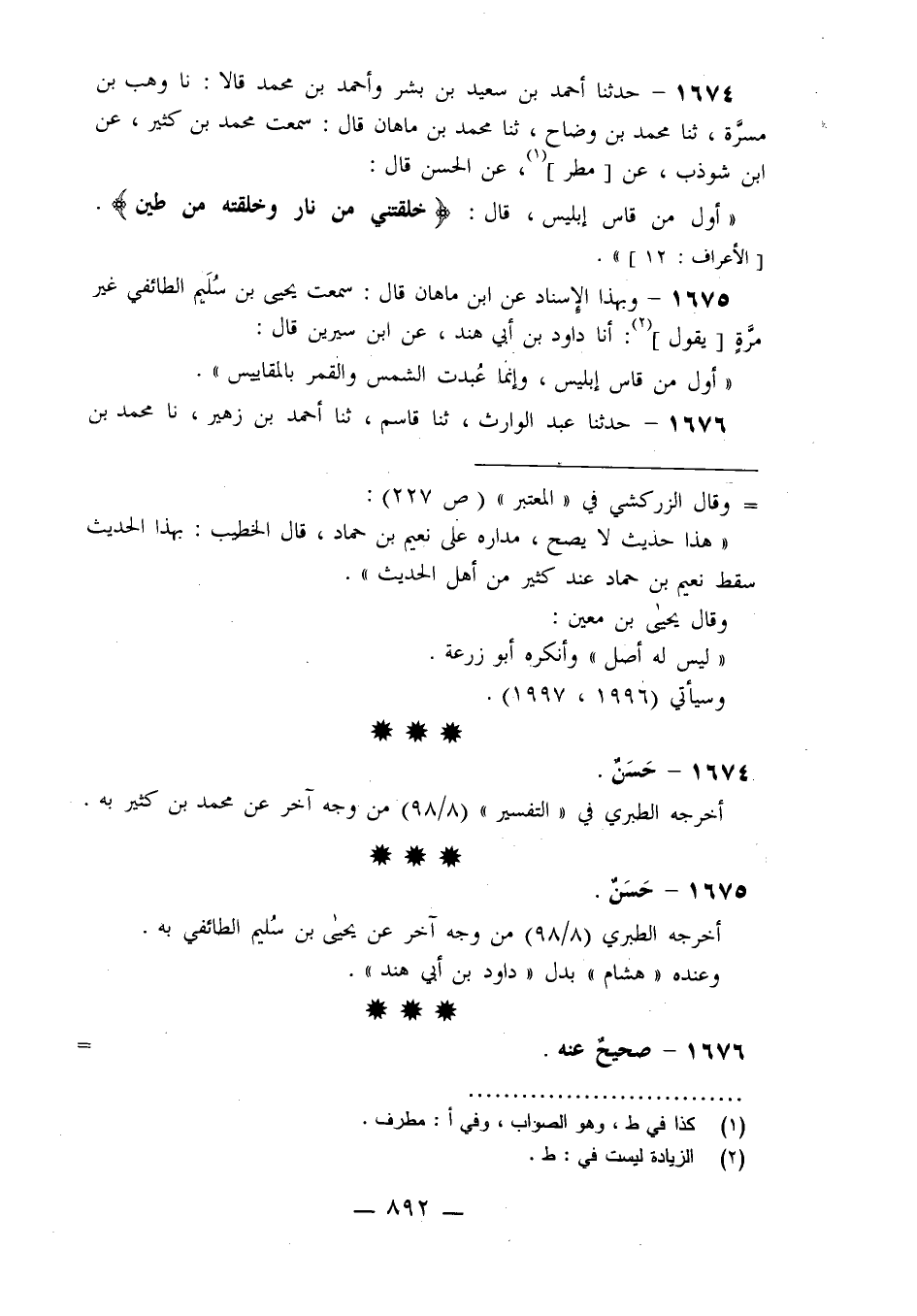 1674 - حَدَّثَنَا أَحْمَدُ بْنُ سَعِيدِ بْنِ بِشْرٍ، وَأَحْمَدُ بْنُ مُحَمَّدٍ قَالَا: نا وَهْبُ بْنُ مَسَرَّةَ، ثنا مُحَمَّدُ بْنُ وَضَّاحٍ، ثنا مُحَمَّدُ بْنُ مَاهَانَ قَالَ: سَمِعْتُ مُحَمَّدَ بْنَ كَثِيرٍ، عَنِ ابْنِ شَوْذَبٍ، عَنْ مَطَرٍ، عَنِ الْحَسَنِ قَالَ: " §أَوَّلُ مَنْ قَاسَ إِبْلِيسُ قَالَ: {خَلَقْتَنِي مِنْ نَارٍ وَخَلَقْتَهُ مِنْ طِينٍ} [الأعراف: 12] "