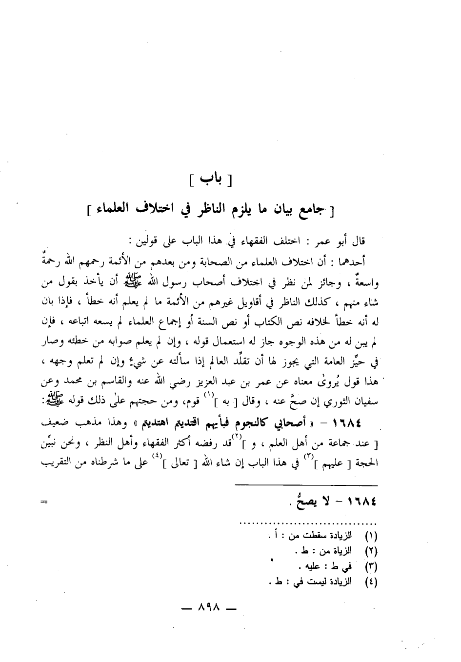 1684 - «أَصْحَابِي كَالنُّجُومِ فَبِأَيِّهِمُ اقْتَدَيْتُمُ اهْتَدَيْتُمْ» ، وَهَذَا مَذْهَبٌ ضَعِيفٌ عِنْدَ جَمَاعَةٍ مِنْ أَهْلِ الْعِلْمِ وَقَدْ رَفَضَهُ أَكْثَرُ الْفُقَهَاءِ وَأَهْلُ النَّظَرِ وَنَحْنُ نُبَيِّنُ الْحُجَّةَ عَلَيْهِمْ فِي هَذَا الْبَابِ إِنْ شَاءَ اللَّهُ تَعَالَى عَلَى مَا شَرَطْنَاهُ مِنَ التَّقْرِيبِ